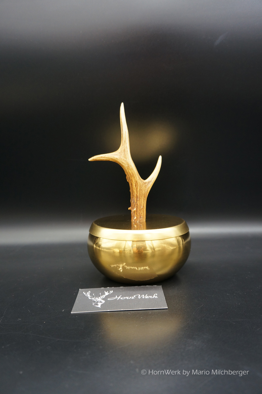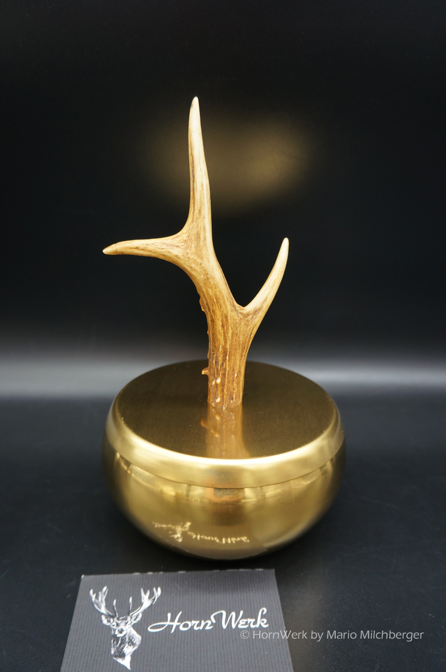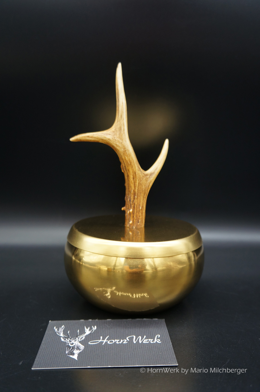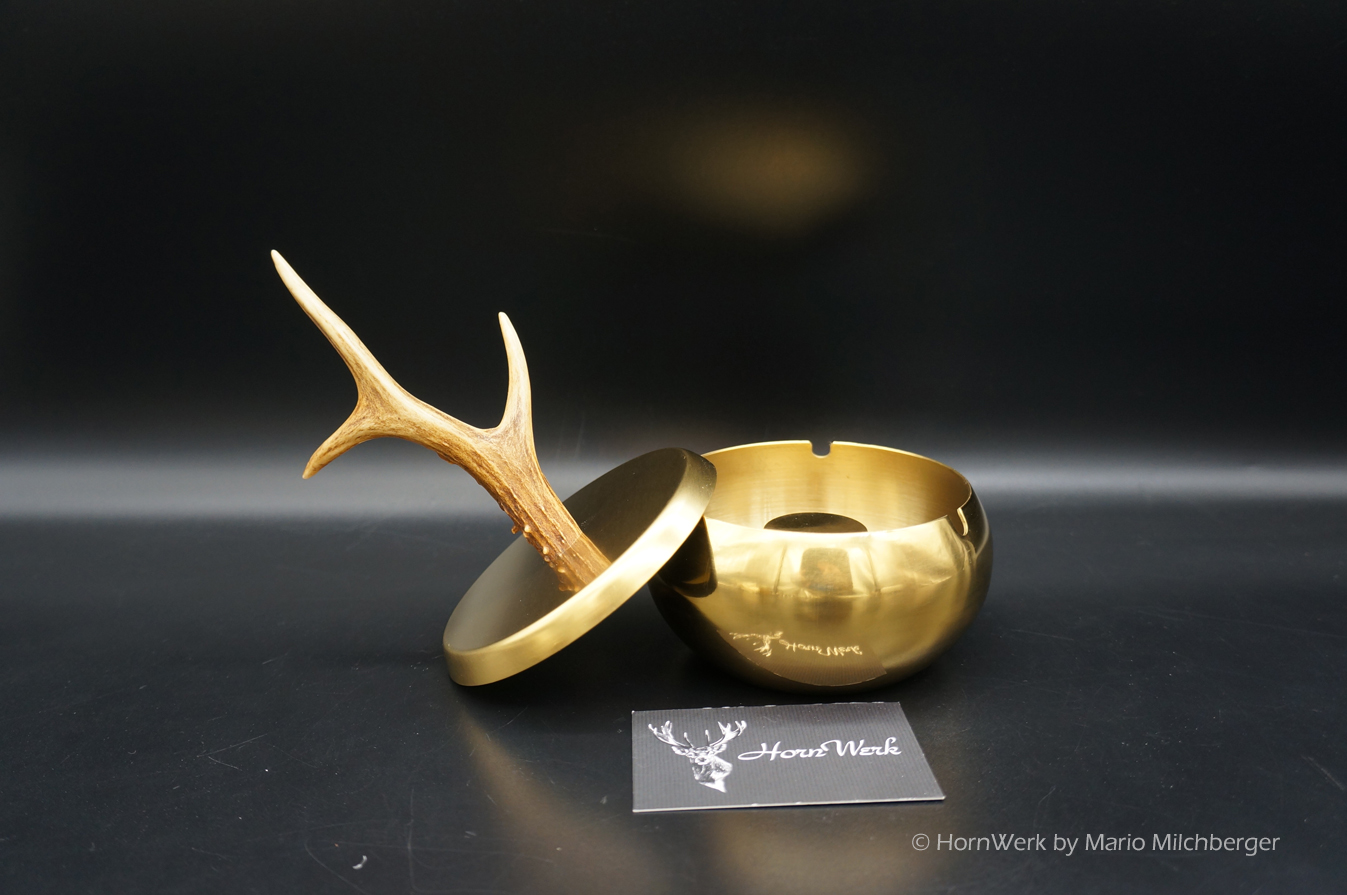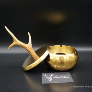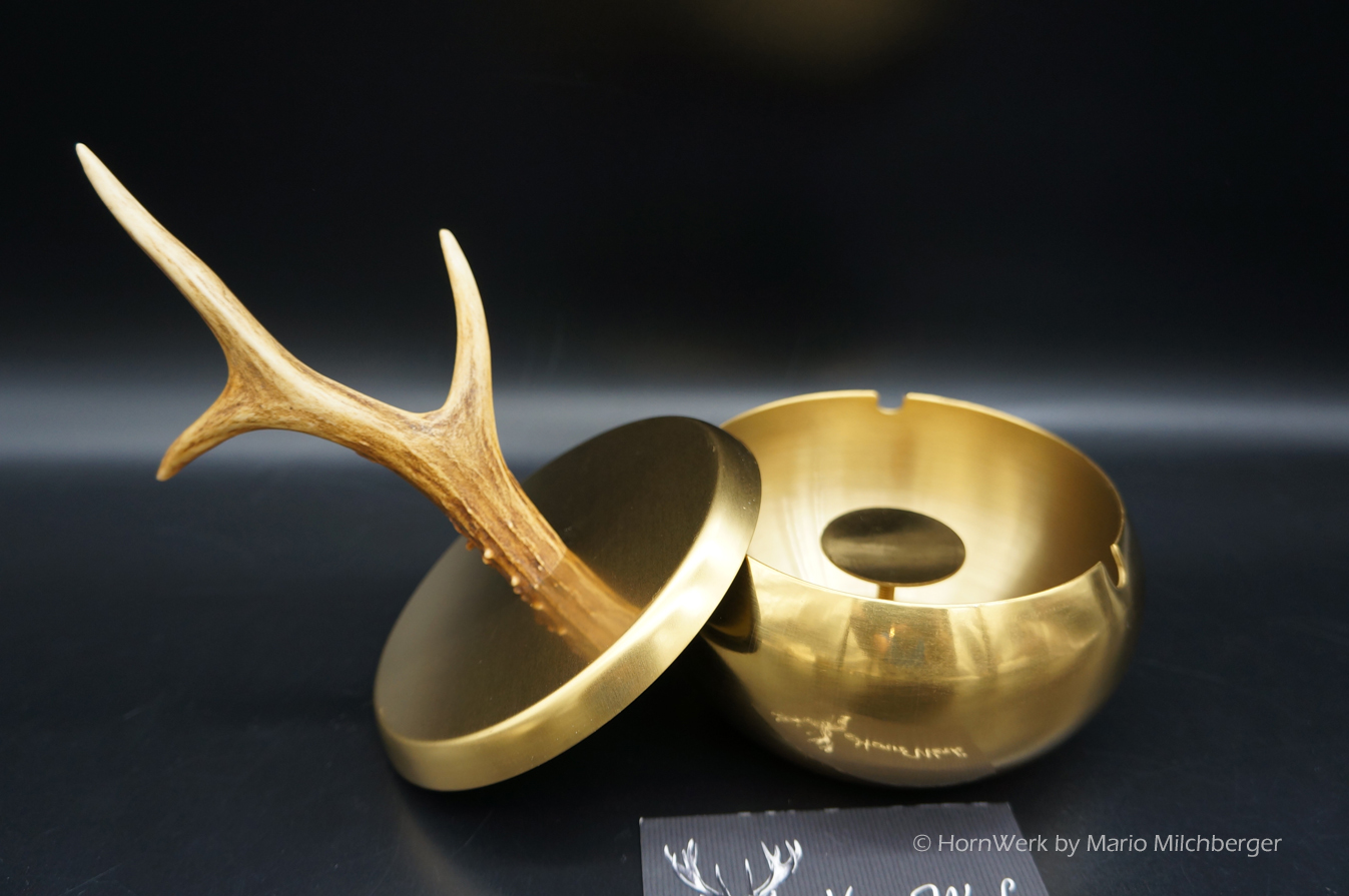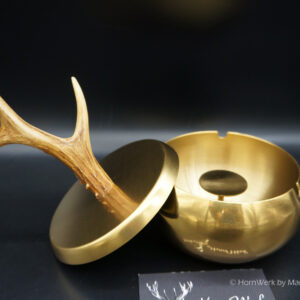 In keiner Jagdhütte oder Jagdstube darf für die Raucher unter uns die passende Ausstattung fehlen. Dieses Einzelstück ist durch seine goldene Farbe sehr auffällig und keinem deiner Gäste wird dieses Unikat entgehen. Der Deckel wird angehoben mit einem Griff aus Reh, welche in Größe und Funktion optimal für dieses Stück angepasst wurde. Ein großartiger und vor allem nützlicher Gebrauchsgegenstand der in keiner Ausstattung fehlen sollte. Ich wünsche bereits vorab viel Freude mit diesem schönen Einzelstück. Lg Wmh Mario vom HornWerk