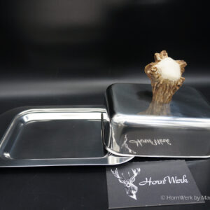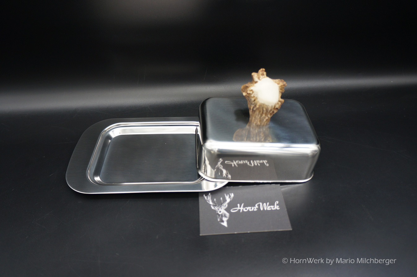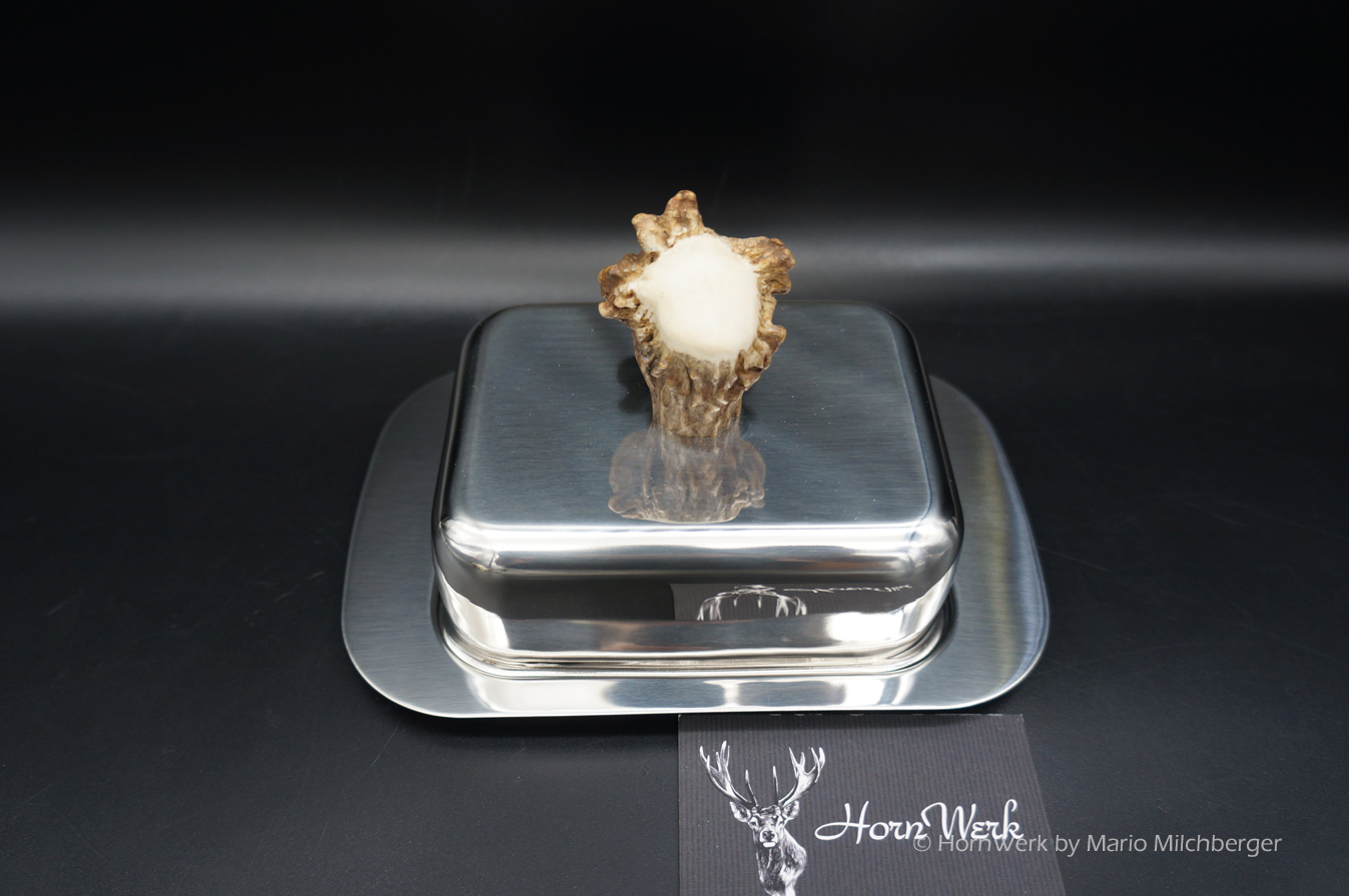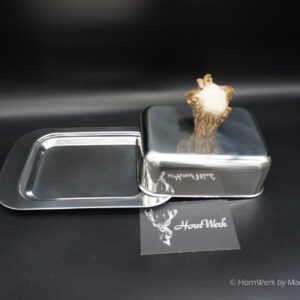 Diese Butterdose aus Edelstahl ist ein wahrer Blickfang. Beste Qualität und wie es sich für ein Original aus dem HornWerk gehört, wird der Deckel angehoben mit einem Griffstück aus Horn. In diesem Fall wurde das Griffstück aus Hirschgeweih gefertigt. Die Rose wurde in Natur belassen. In Optik und Design kaum zu schlagen, darf dieses Stück in keiner Jagdküche fehlen. Ich wünsche bereits vorab viel Freude mit diesem schönen Einzelstück. Lg Wmh Mario vom HornWerk. (65)