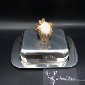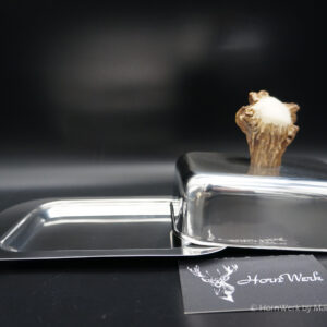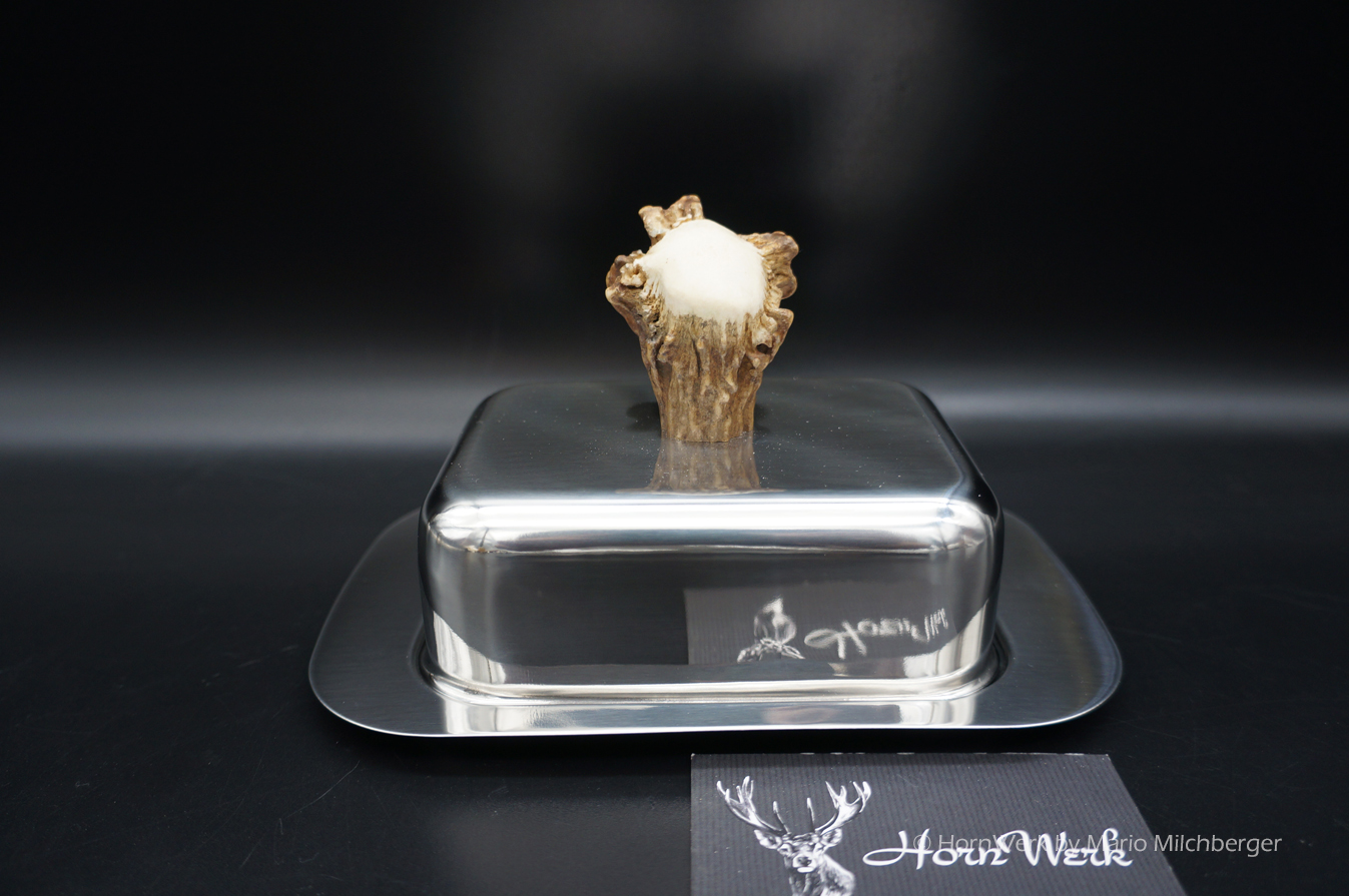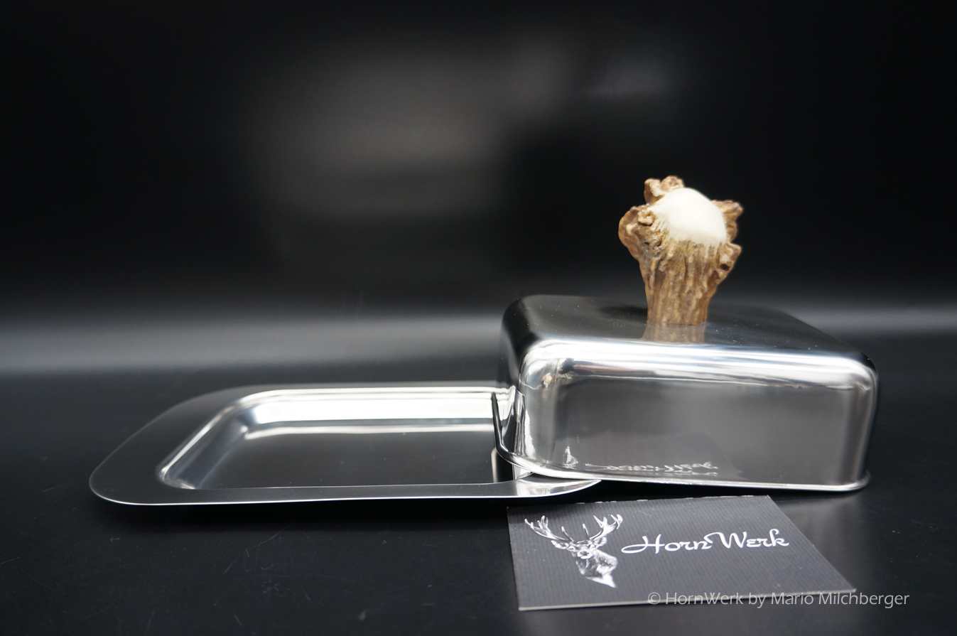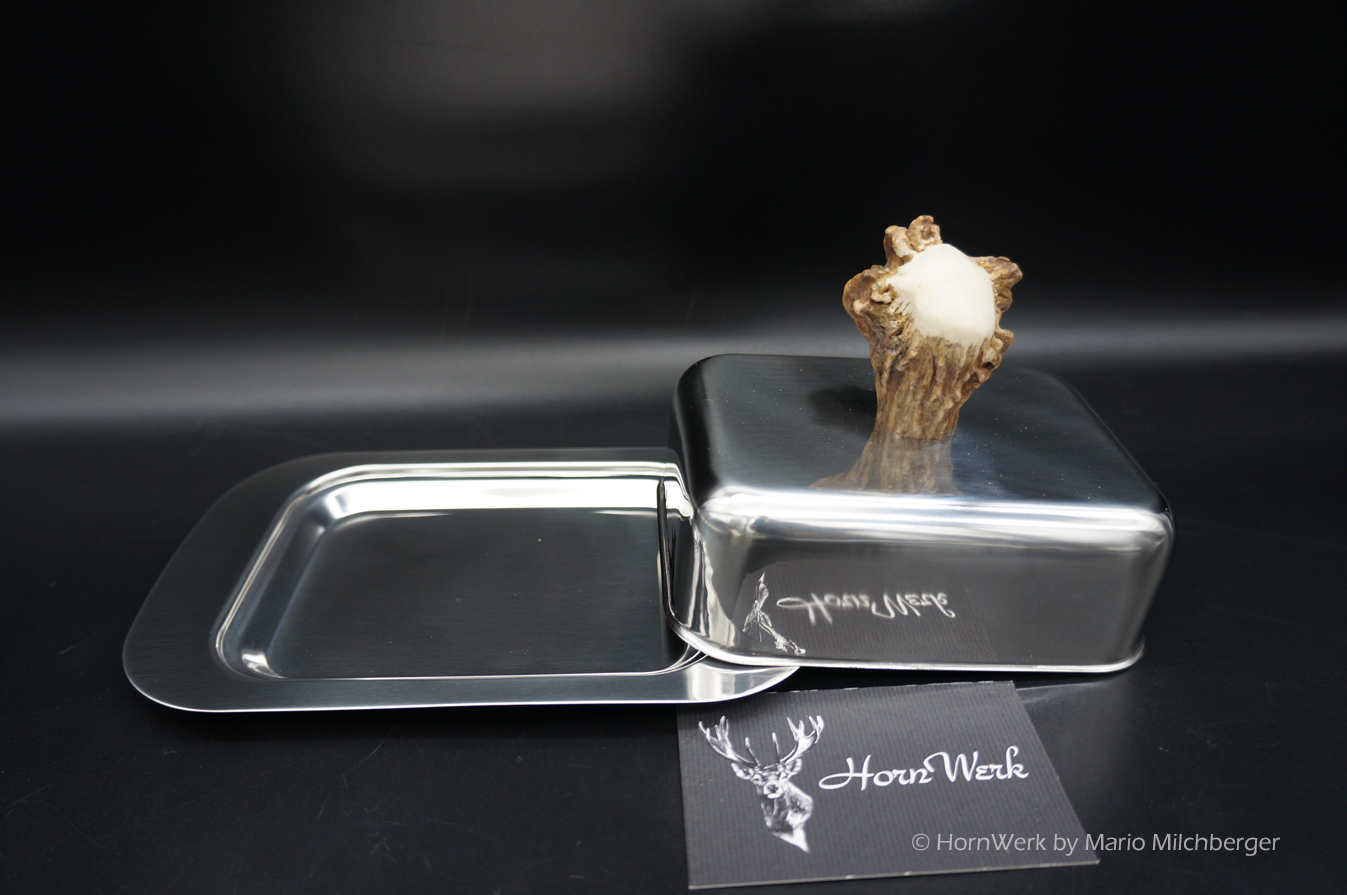 Diese Butterdose aus Edelstahl ist ein wahrer Blickfang. Beste Qualität und wie es sich für ein Original aus dem HornWerk gehört, wird der Deckel angehoben mit einem Griffstück aus Horn. In diesem Fall wurde das Griffstück aus Hirschgeweih gefertigt. Die Rose wurde in Natur belassen. In Optik und Design kaum zu schlagen, darf dieses Stück in keiner Jagdküche fehlen. Ich wünsche bereits vorab viel Freude mit diesem schönen Einzelstück. Lg Wmh Mario vom HornWerk. (65)