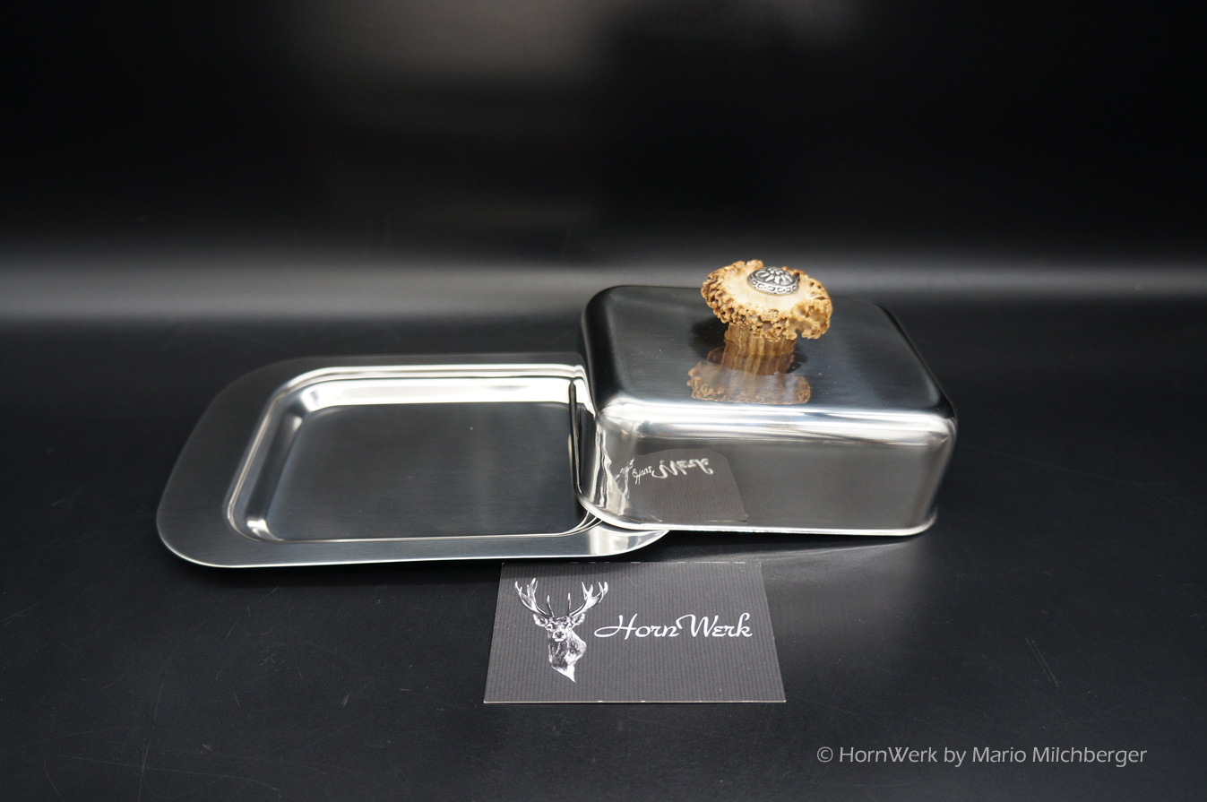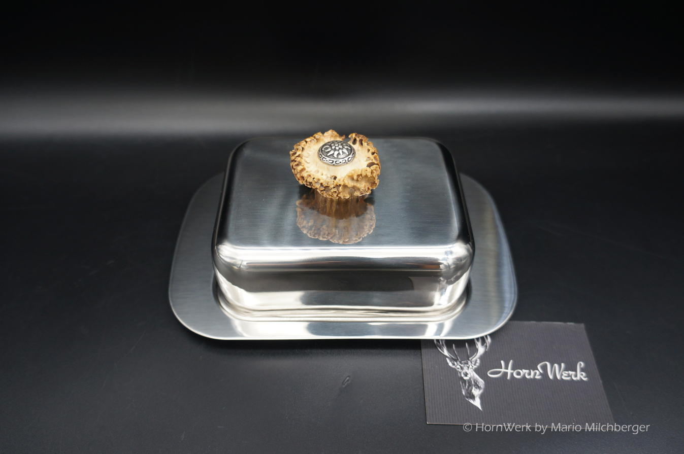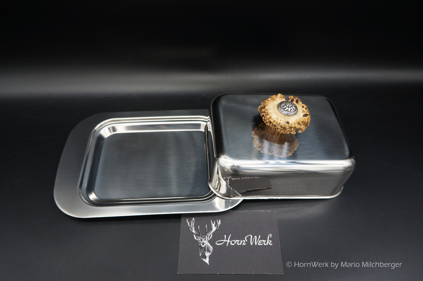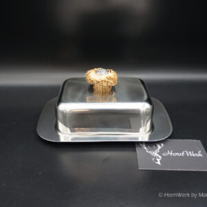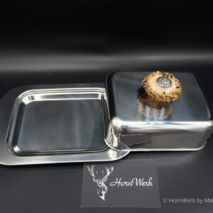 Diese Butterdose gefertigt aus Edelstahl ist ein wahrer Blickfang. Beste Qualität und wie es sich für ein Original aus dem HornWerk gehört, wird der Deckel angehoben mit einem Griffstück aus Horn. In diesem Fall wurde das Griffstück aus einer Rehrose inkl. aufgesetztem Edelweiß gefertigt. In Optik und Design kaum zu überbieten darf dieses Stück in keiner jagdlichen Küche fehlen. Ich wünsche bereits vorab viel Freude mit diesem schönen Einzelstück. Lg Wmh Mario vom HornWerk.