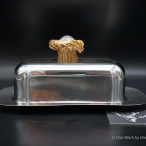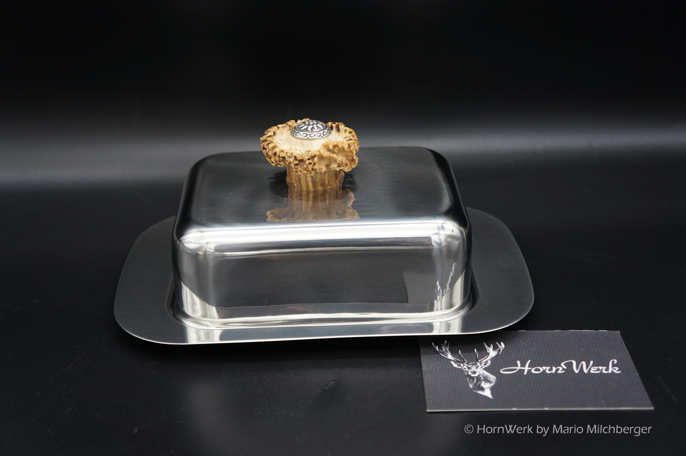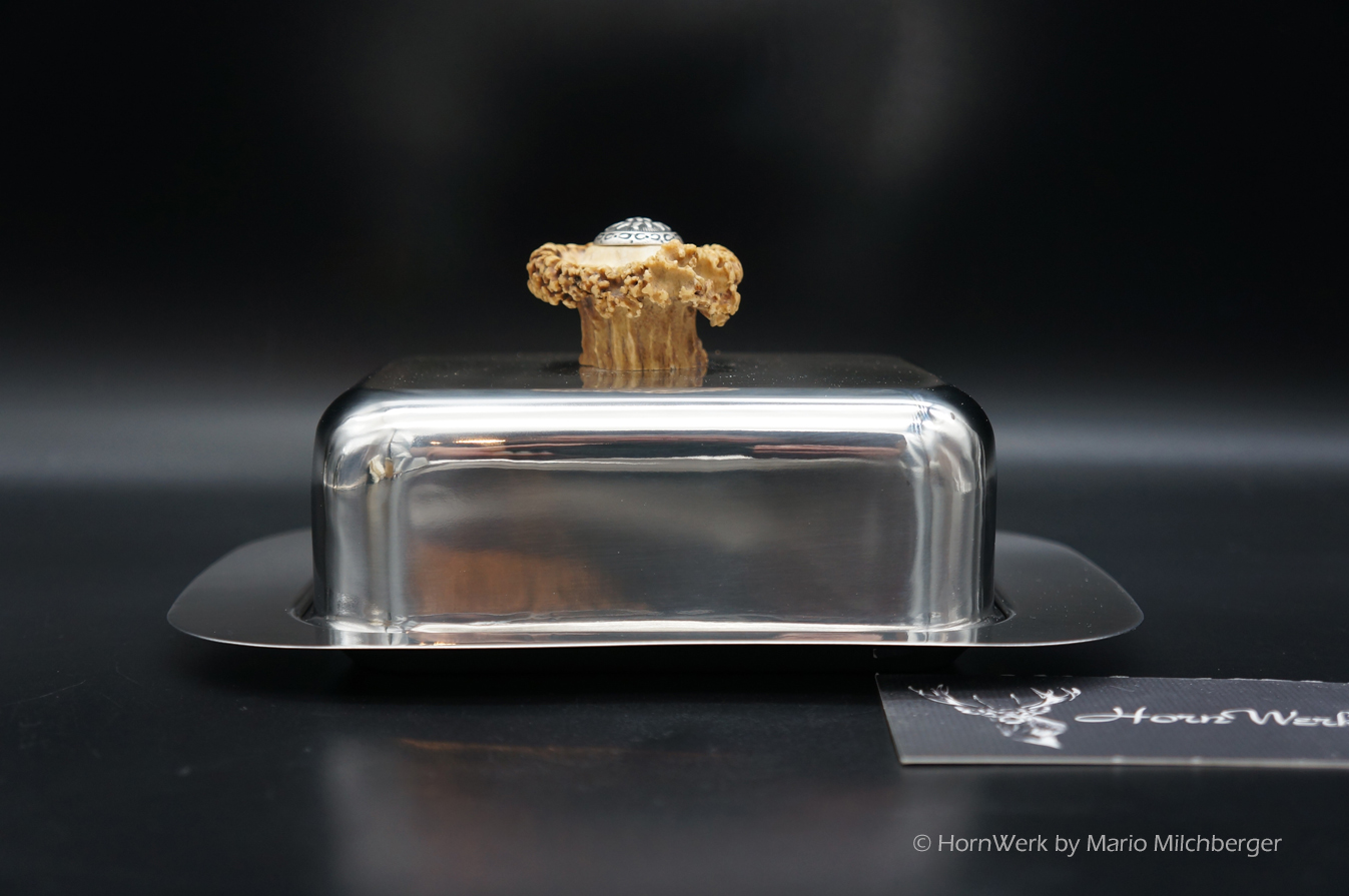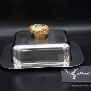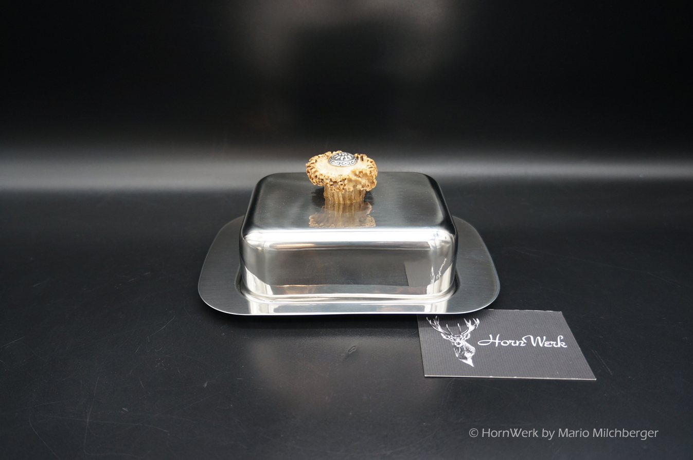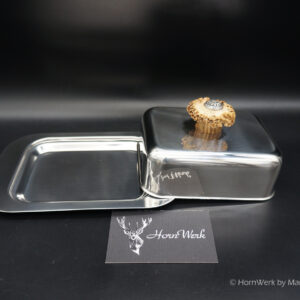 Diese Butterdose gefertigt aus Edelstahl ist ein wahrer Blickfang. Beste Qualität und wie es sich für ein Original aus dem HornWerk gehört, wird der Deckel angehoben mit einem Griffstück aus Horn. In diesem Fall wurde das Griffstück aus einer Rehrose inkl. aufgesetztem Edelweiß gefertigt. In Optik und Design kaum zu überbieten darf dieses Stück in keiner jagdlichen Küche fehlen. Ich wünsche bereits vorab viel Freude mit diesem schönen Einzelstück. Lg Wmh Mario vom HornWerk.