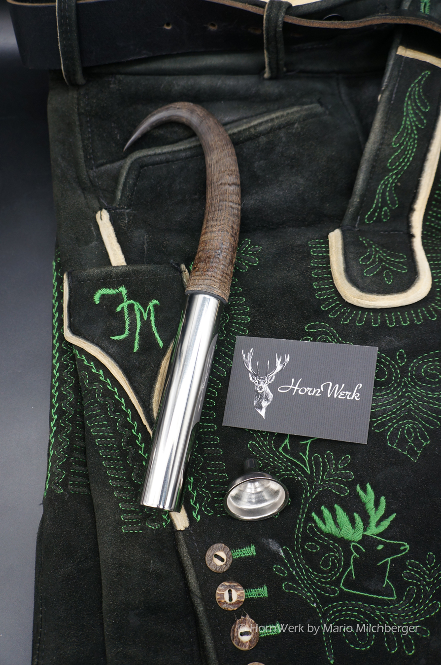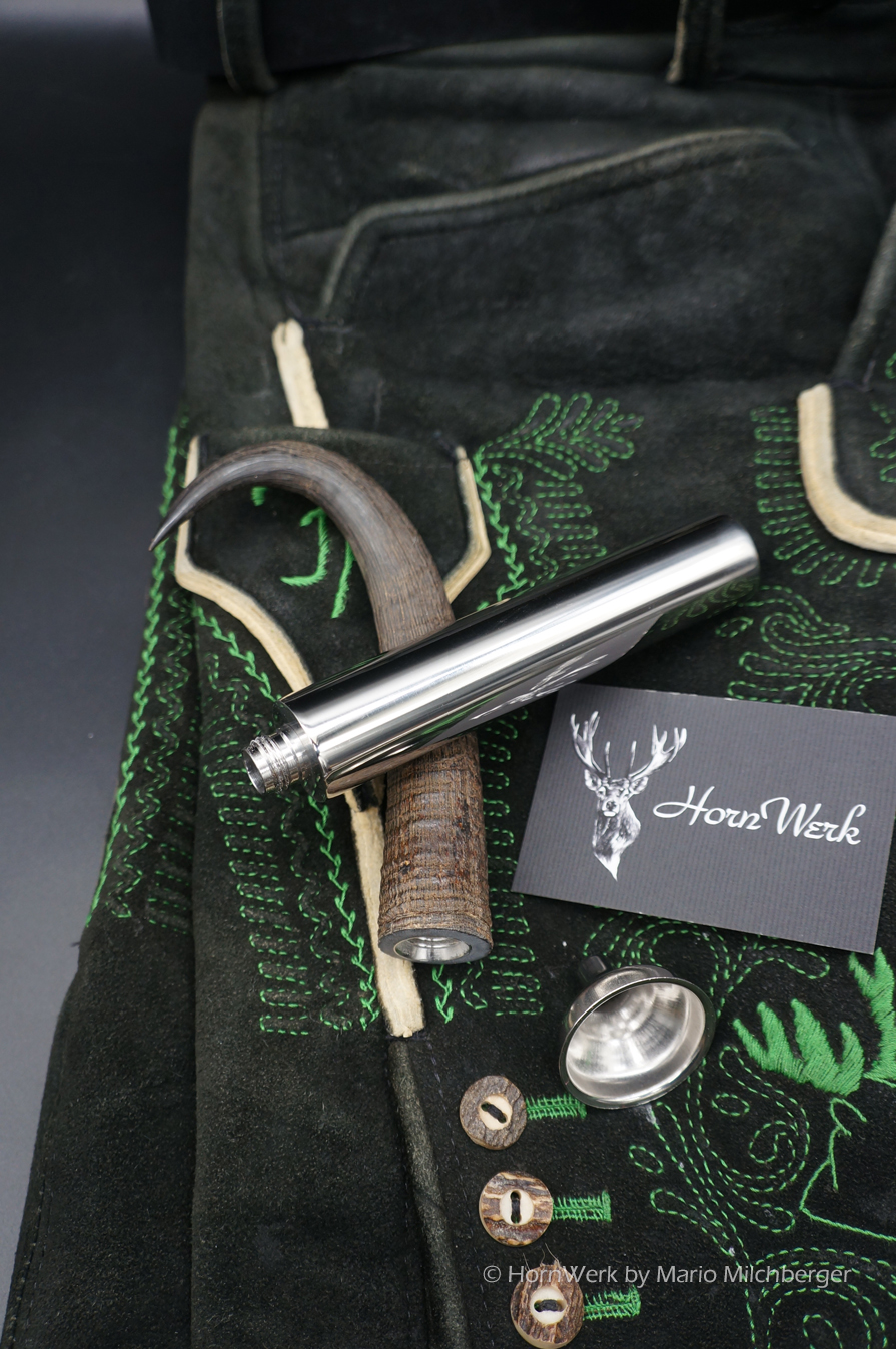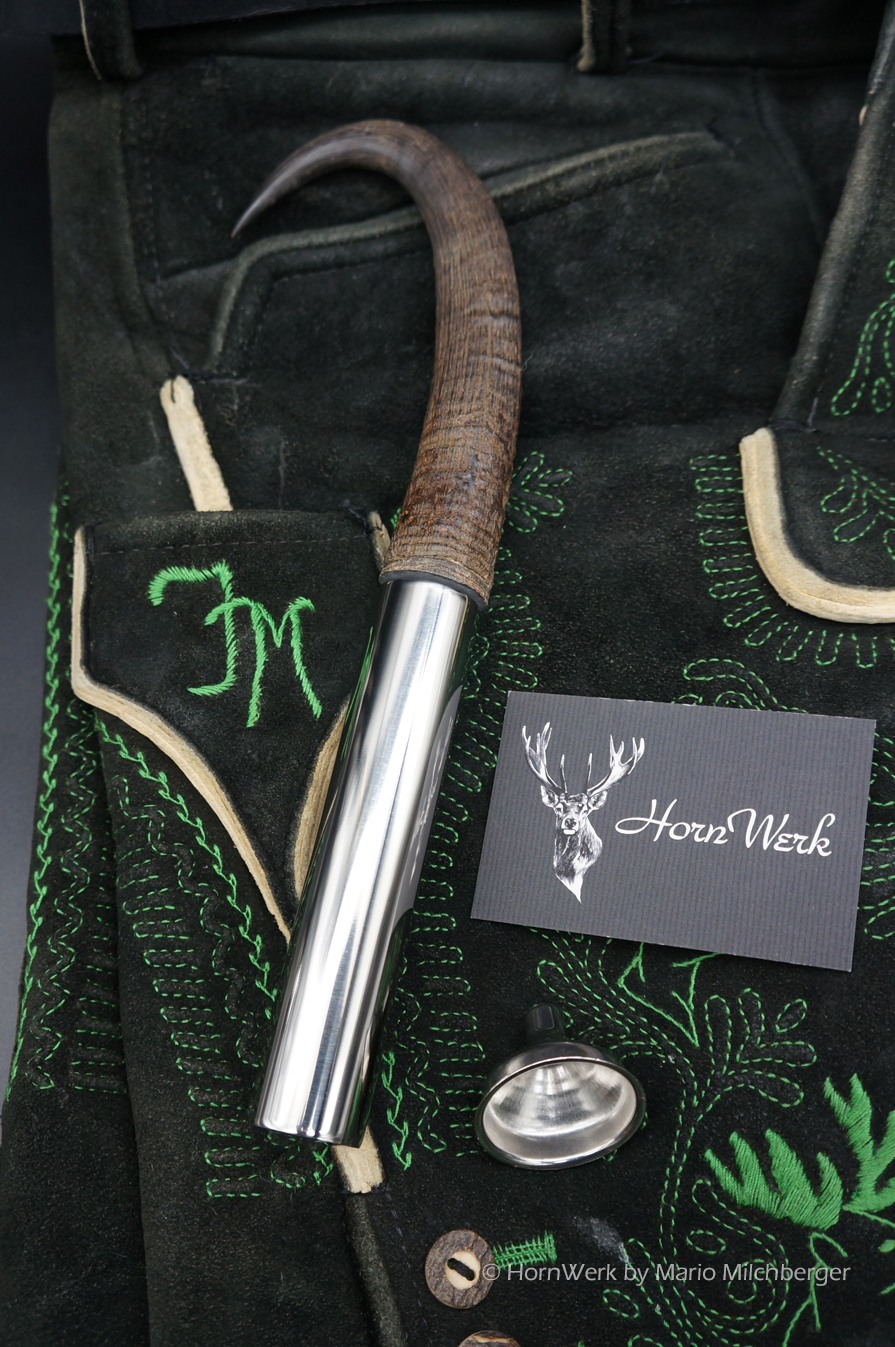 In vielen Situationen ist ein Jagdmesser das falsche in der Ledernen. Bei Festen und Feiern, bei Geburtstagen von Jagdfreunden ist ein HornWerk Flachmann das perfekte Accessoire in der Messertasche der Lederhose. Diesen speziellen Flachmann zeichnet die Verarbeitung in einen starken Gamsschlauch aus. Der Drehverschluss wurde in das Griffstück mit Harz eingegossen. Trage dieses Unikat in der Lederhose und bei Bedarf ziehe es hervor und sorge so für begeisterte Blicke und einen guten Schluck. Ich wünsche bereits jetzt PROST und zum Wohl. Lg Wmh Mario vom HornWerk