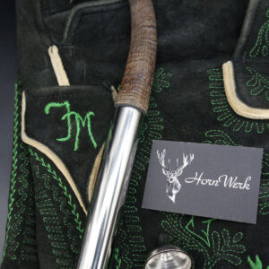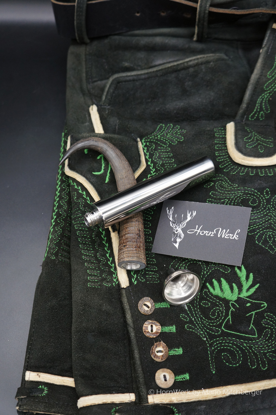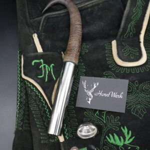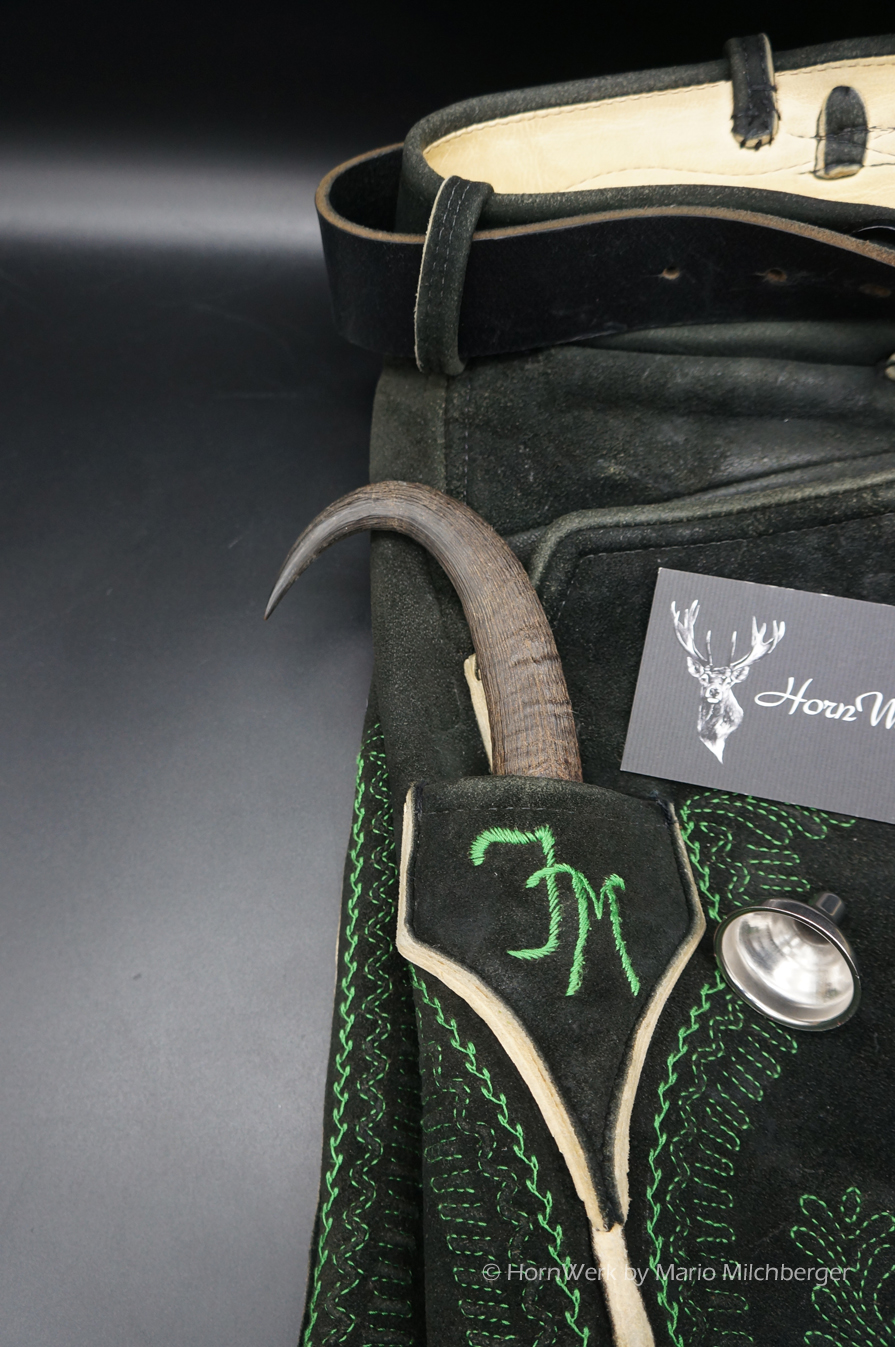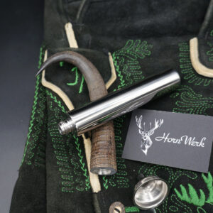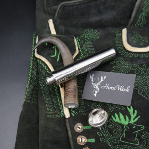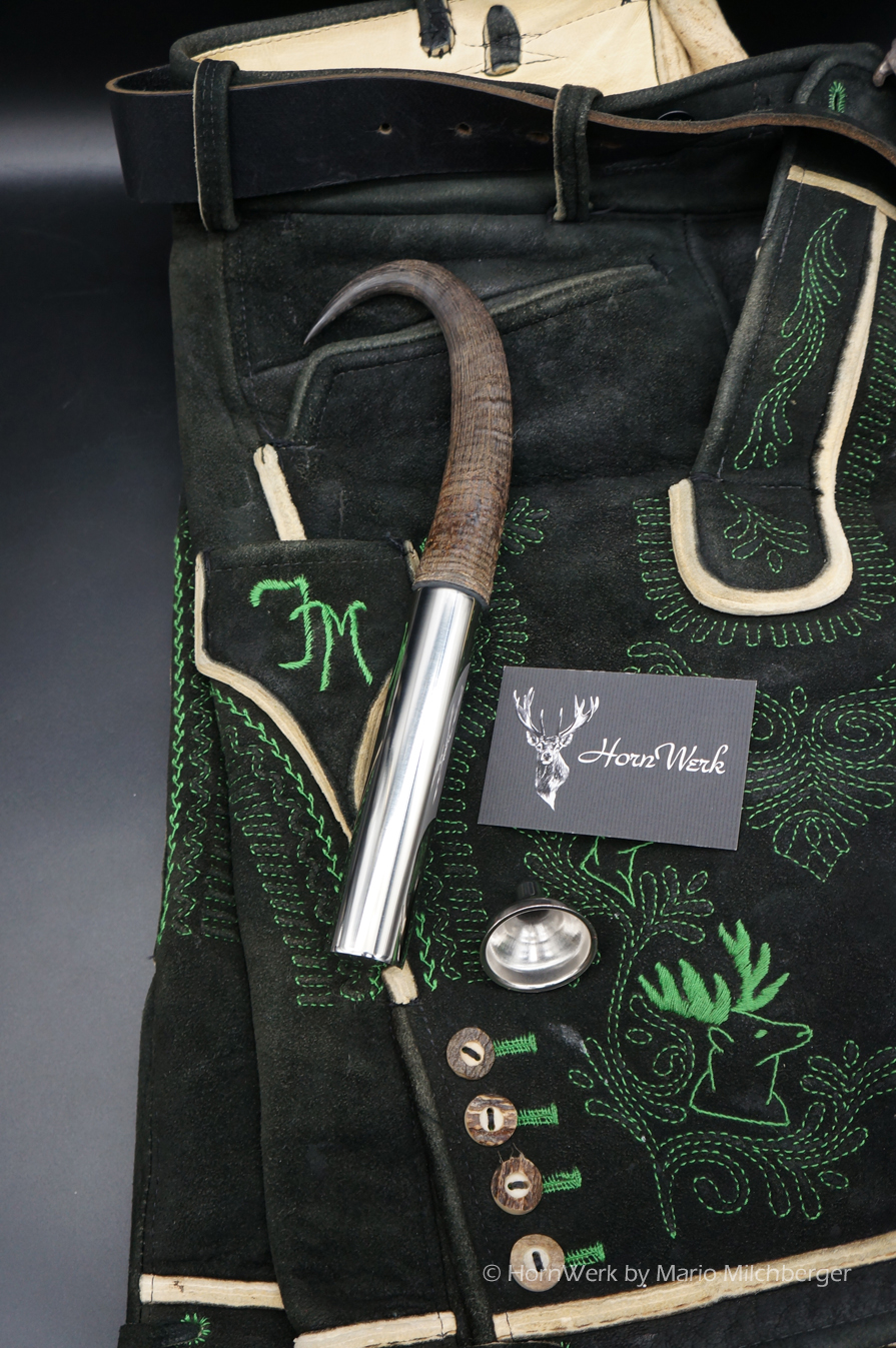 In vielen Situationen ist ein Jagdmesser das falsche in der Ledernen. Bei Festen und Feiern, bei Geburtstagen von Jagdfreunden ist ein HornWerk Flachmann das perfekte Accessoire in der Messertasche der Lederhose. Diesen speziellen Flachmann zeichnet die Verarbeitung in einen starken Gamsschlauch aus. Der Drehverschluss wurde in das Griffstück mit Harz eingegossen. Trage dieses Unikat in der Lederhose und bei Bedarf ziehe es hervor und sorge so für begeisterte Blicke und einen guten Schluck. Ich wünsche bereits jetzt PROST und zum Wohl. Lg Wmh Mario vom HornWerk