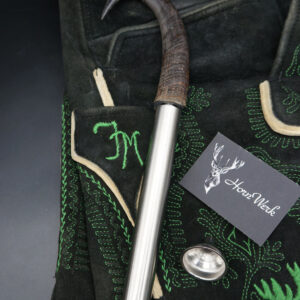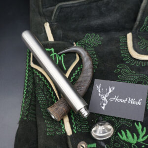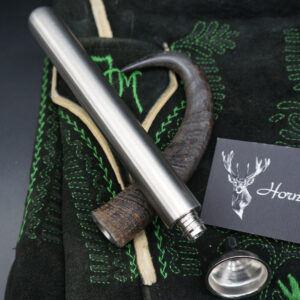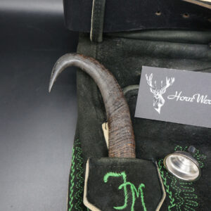 In vielen Situationen ist ein Jagdmesser das falsche in der Ledernen. Bei Festen und Feiern, bei Geburtstagen von Jagdfreunden ist ein HornWerk Flachmann das perfekte Accessoire in der Messertasche der Lederhose. Diesen speziellen Flachmann zeichnet die Verarbeitung in einen starken Gamsschlauch aus. Der Drehverschluss wurde in das Griffstück mit Harz eingegossen. Trage dieses Unikat in der Lederhose und bei Bedarf ziehe es hervor und sorge so für begeisterte Blicke und einen guten Schluck. Ich wünsche bereits jetzt PROST und zum Wohl. Lg Wmh Mario vom HornWerk