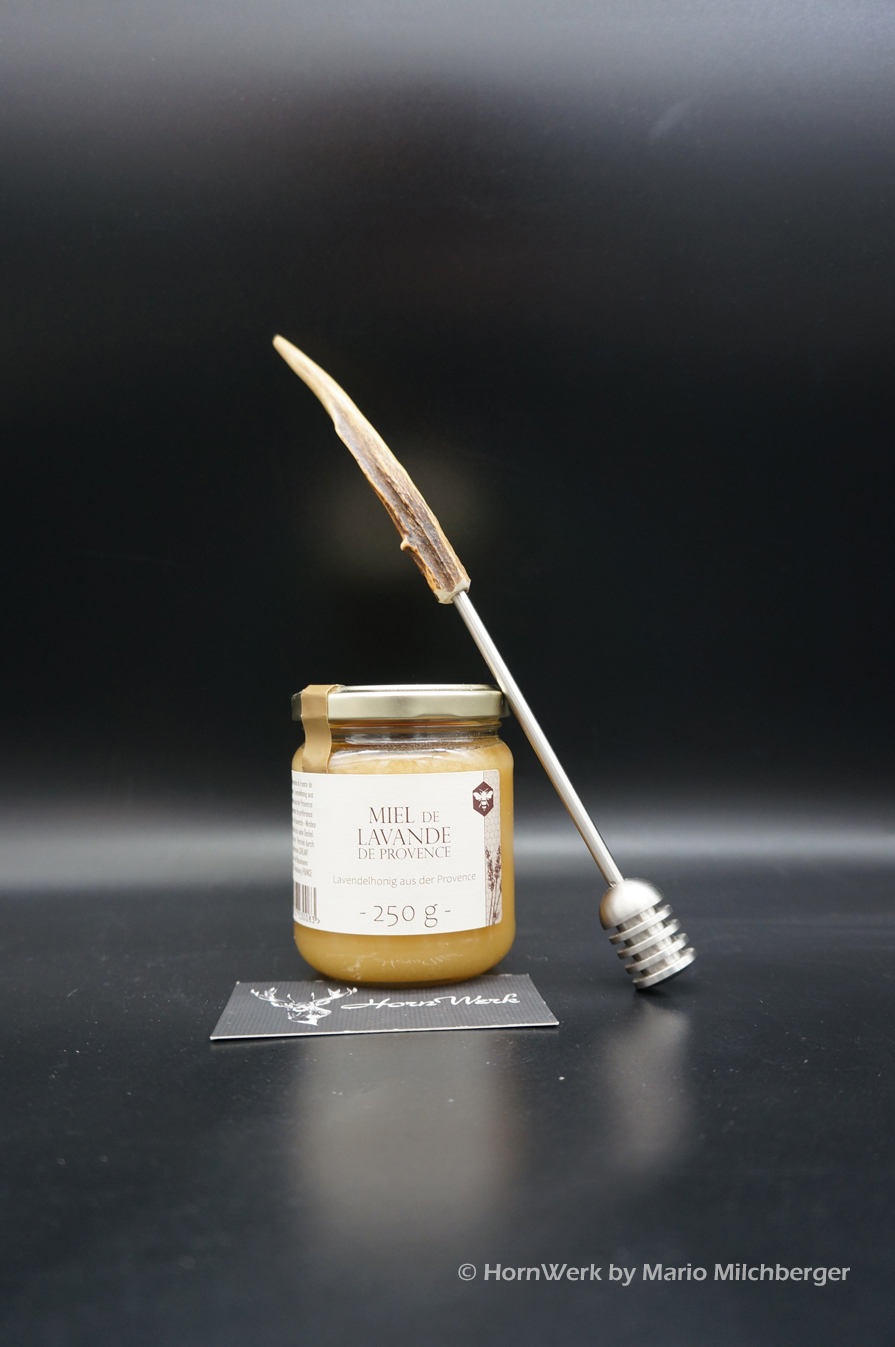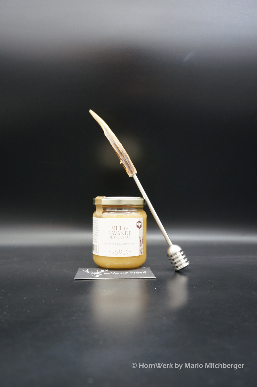 Einfach großartig für alle Honigliebhaber. Der perfekte Honiglöffel aus dem HornWerk. Das Griffstück wurde bei diesem Unikat aus Reh gefertigt. Der Löffel selbst ist aus Edelstahl gefertigt. In Optik und Funktion ein großartiges Unikat, welches für viele begeisterte Blicke sorgen wird. Die Honigaufnahme kann abgeschraubt und im Geschirrspüler gereinigt werden. PS: mein französischer Lavendelhonig ist nicht im Lieferumfang enthalten. Ich wünsche bereits jetzt viel Freude mit diesem schönen Stück. Lg Wmh Mario vom HornWerk