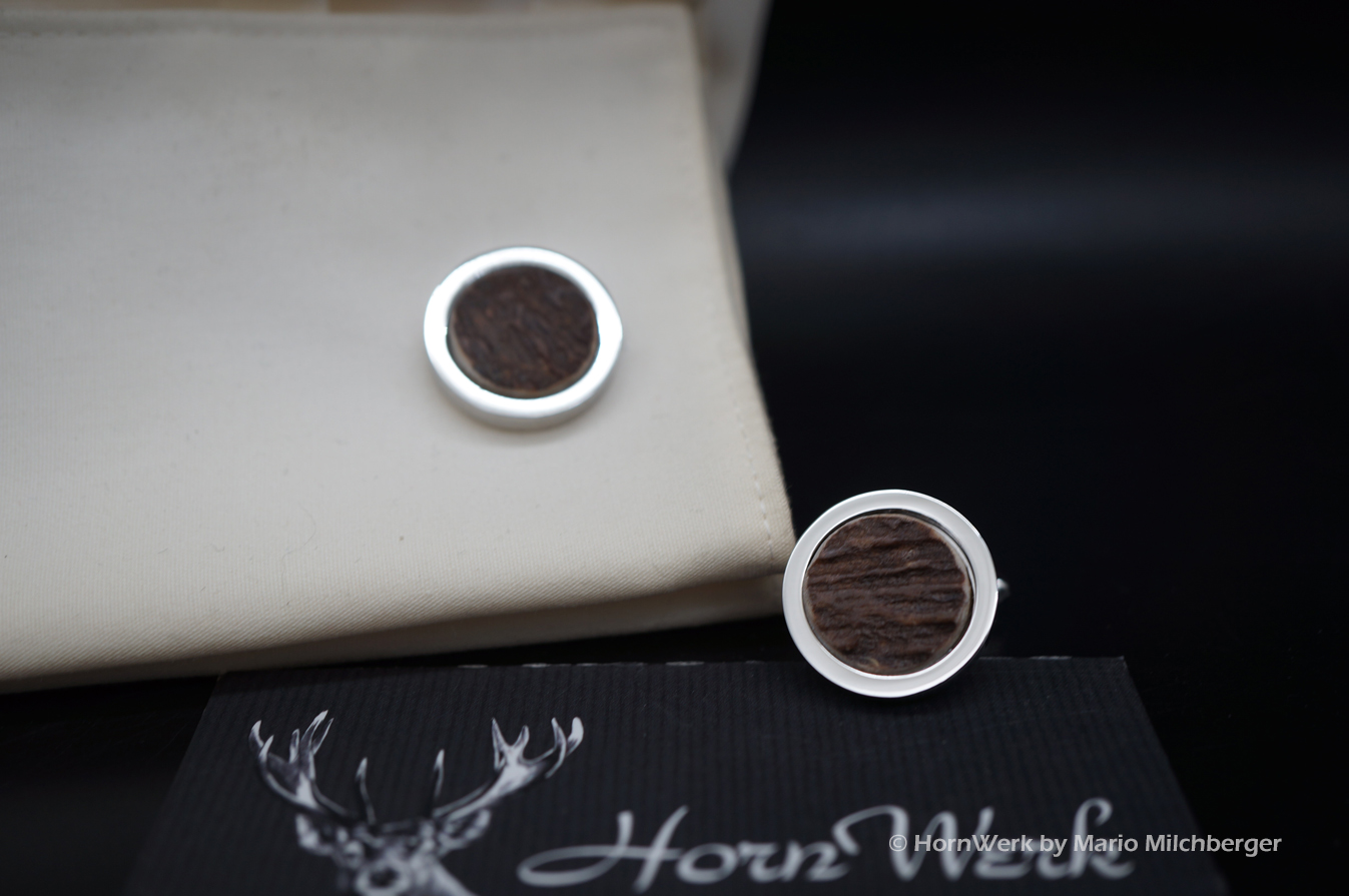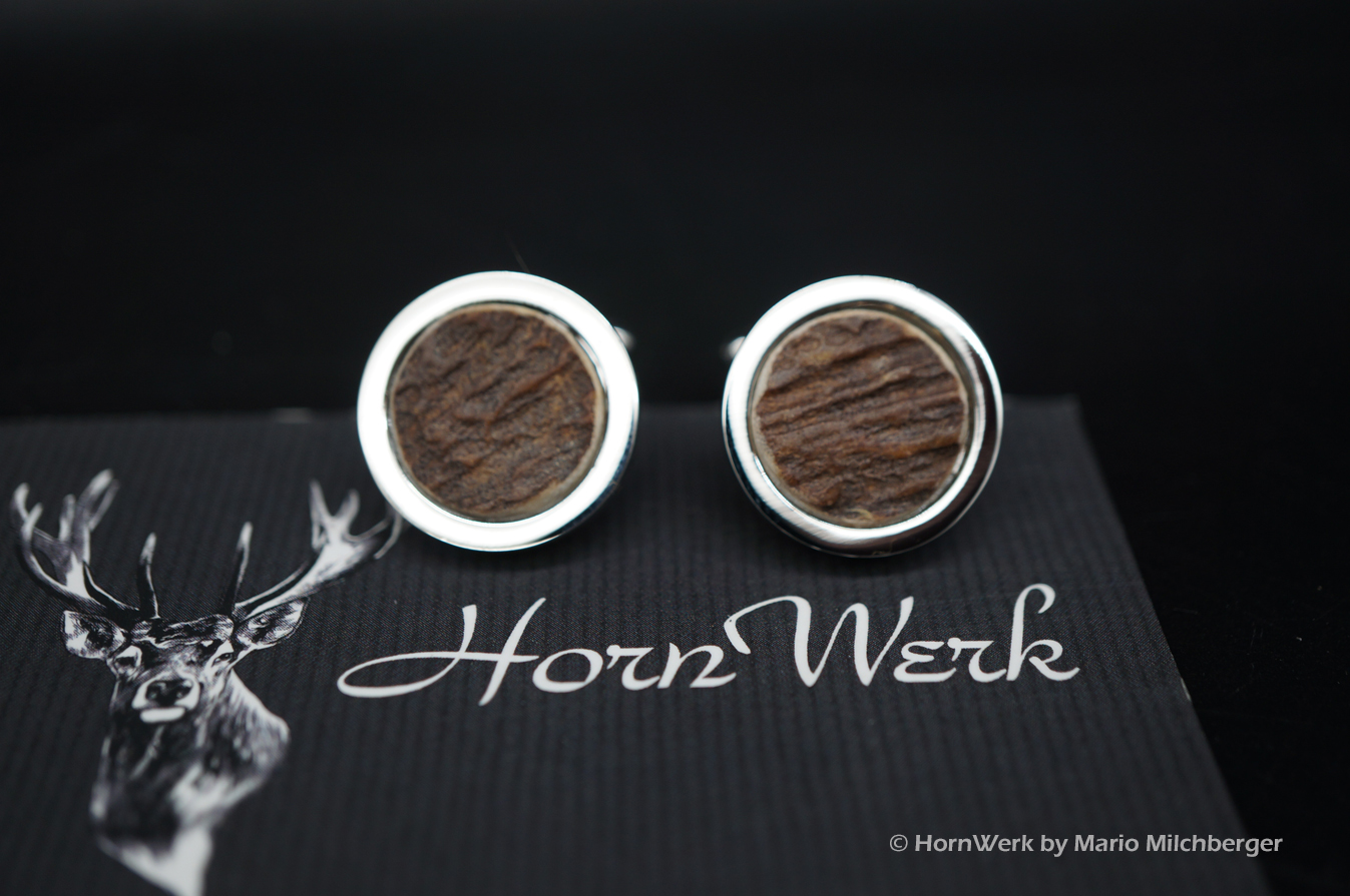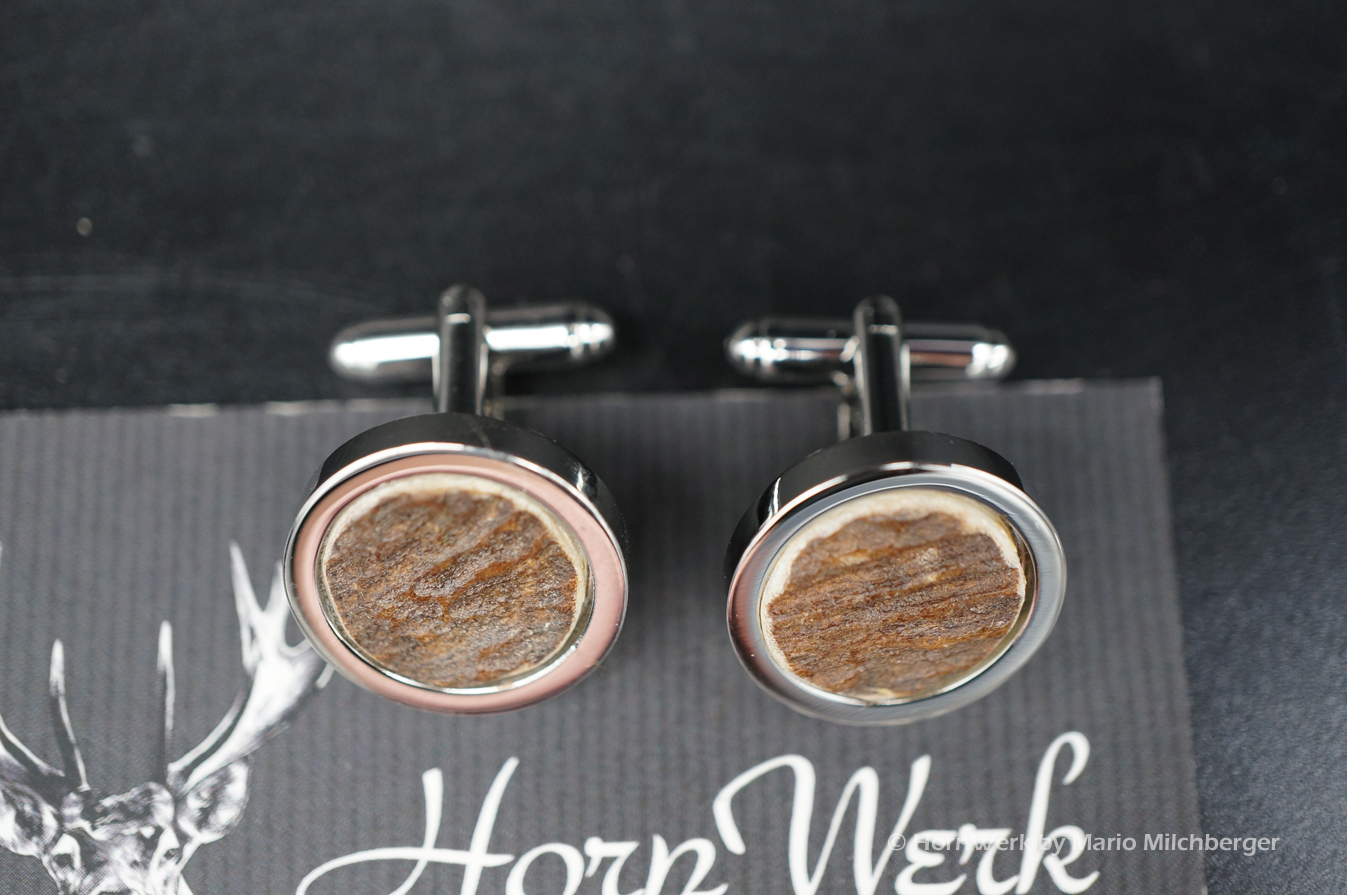 HornWerk Manschettenknöpfe für Jäger sind das absolutes Highlight beim Auftritt mit Hemd. Gefertigt wurden diese beiden Unikate aus Hirschhorn. Jedes dieser Einzelstücke ist an Optik kaum zu überbieten und diese Schmuckstücke verleihen seinem künftigen Träger das gewisse Etwas. Der Durchmesser beträgt bei diesen Einzelstücken 19mm. Modernes Design mit handwerklicher Kunst aus dem HornWerk kombiniert wertet jede Tracht weiter auf und dieses Set wird unzählige Blicke auf sich ziehen. Laufe nicht Gefahr, dieses Schmuckstück bei jemand anderem zu sehen denn dieses besondere Set wird für große Begeisterung sorgen. Einzigartige Stücke für einzigartige Menschen. So sehen und leben wir das im HornWerk. Lg Wmh Mario vom HornWerk (75)