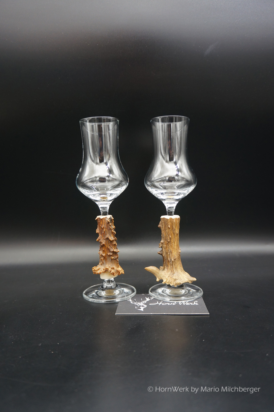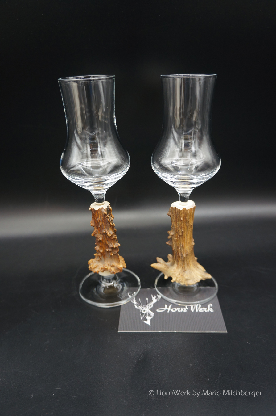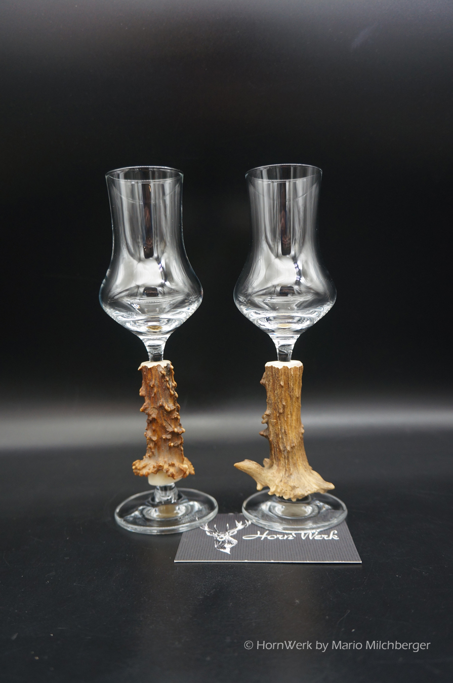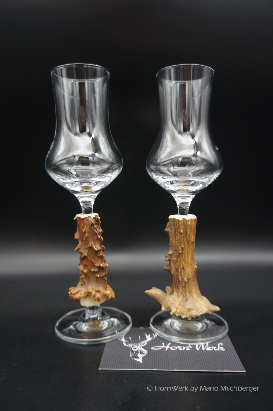 Ein großartiges und wunderschönes 2er Set Schnapsgläser. Die Griffstücke bei diesen beiden Einzelstücken wurden aus Reh gefertigt. Nicht nur optisch ein Highlight sondern durch die Griffstücke aus Geweih, liegen diese Gläser ausgezeichnet und absolut Rutschfest in der Hand. Als Rohling diente bei diesen Stücken ein hochwertiges Glas der Marke Schott Zwiesel. Auf Wunsch fertige ich auch andere Hersteller. Ein großartiger Blickfang der alle Anwesenden begeistern wird. Ich wünsche bereits vorab viel Freude mit diesen schönen Unikaten und wünsche schon jetzt: Prost und zum Wohl. Lg Wmh Mario vom HornWerk