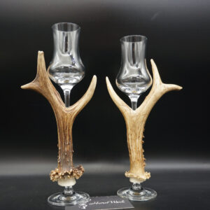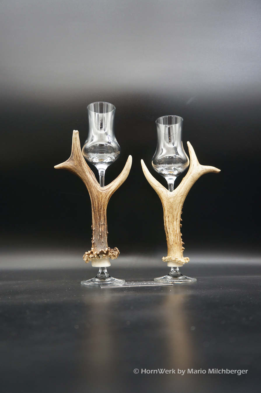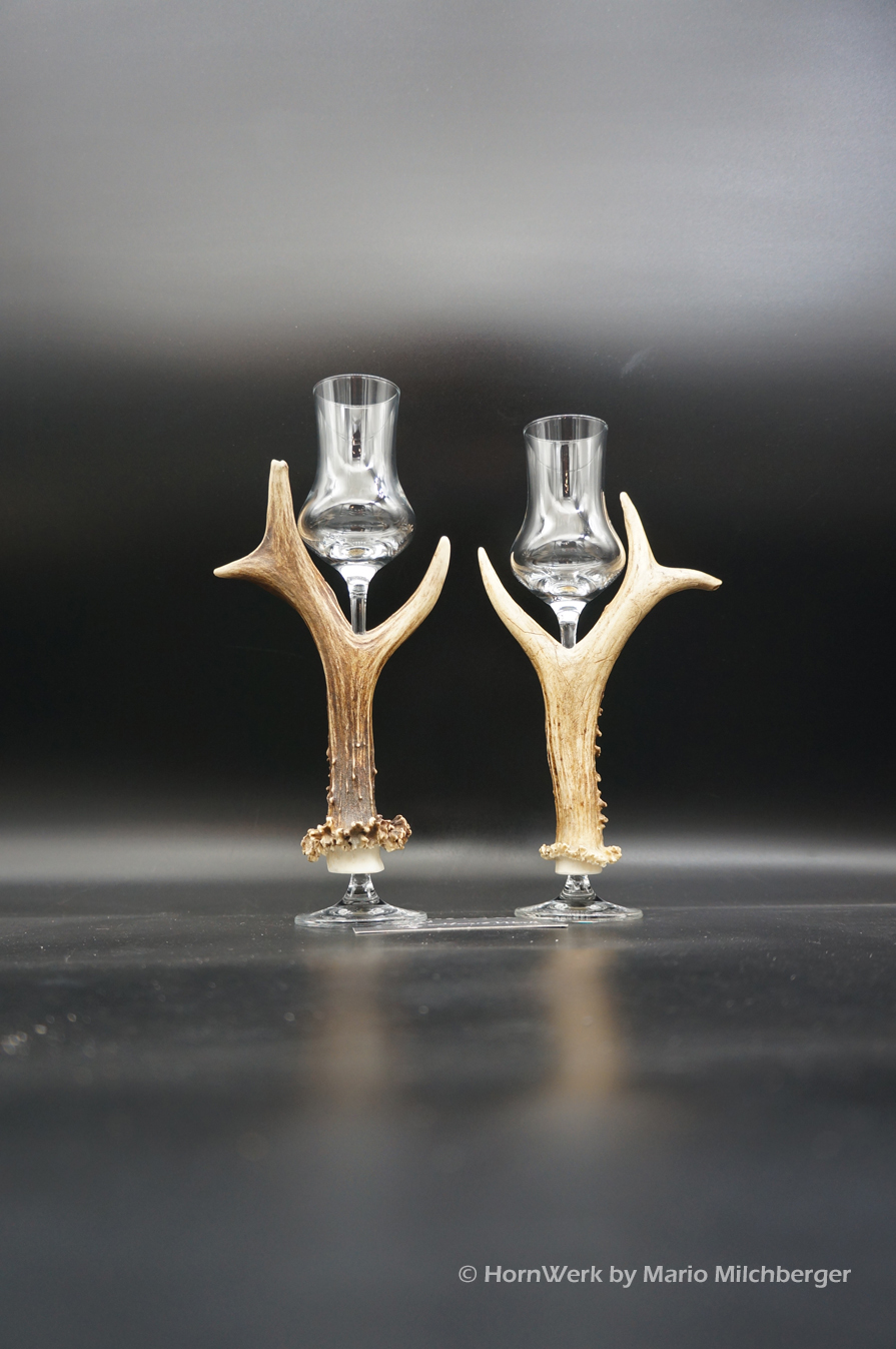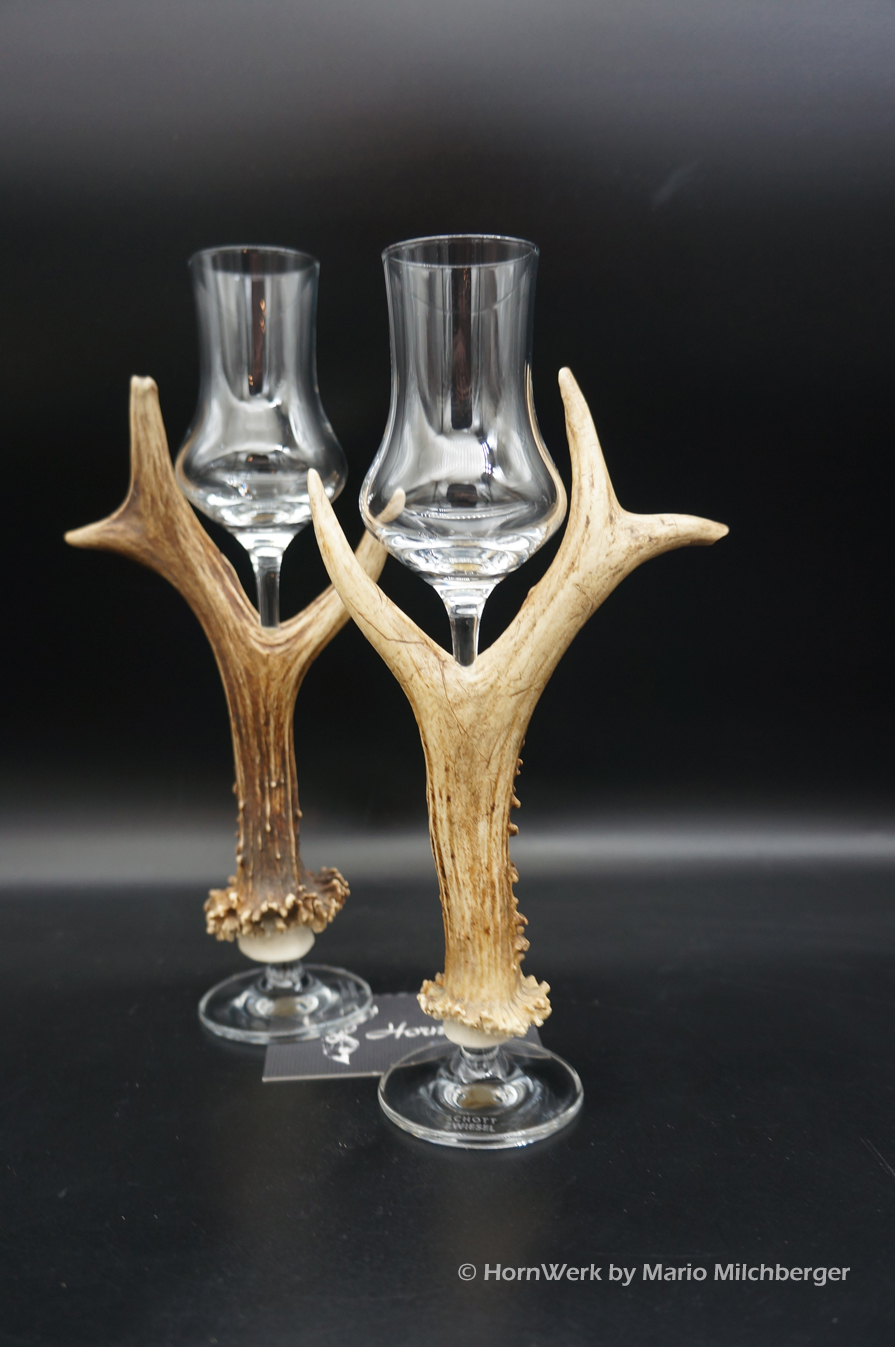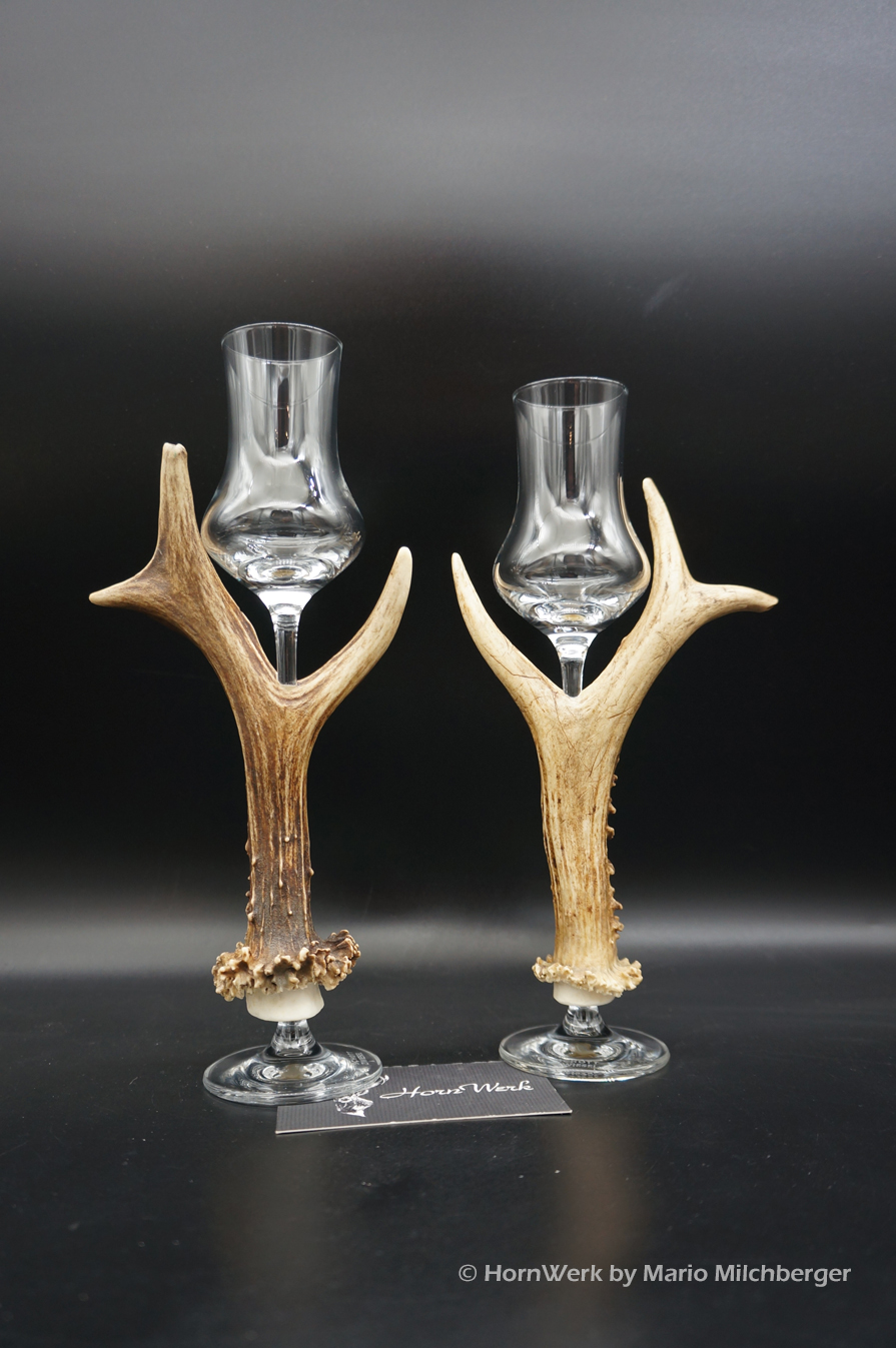 Ein großartiges und wunderschönes 2er Set Schnapsgläser. Die Griffstücke bei diesen beiden Einzelstücken wurden aus Reh gefertigt. Nicht nur optisch ein Highlight sondern durch die Griffstücke aus Geweih, liegen diese Gläser ausgezeichnet und absolut Rutschfest in der Hand. Als Rohling diente bei diesen Stücken ein hochwertiges Glas der Marke Schott Zwiesel. Auf Wunsch fertige ich auch andere Hersteller. Ein großartiger Blickfang der alle Anwesenden begeistern wird. Ich wünsche bereits vorab viel Freude mit diesen schönen Unikaten und wünsche schon jetzt: Prost und zum Wohl. Lg Wmh Mario vom HornWerk (96)