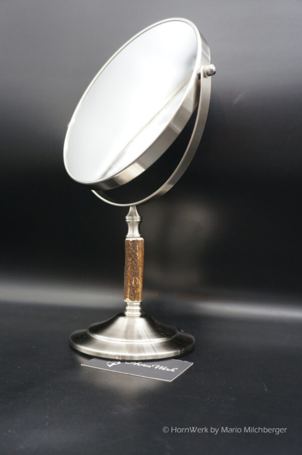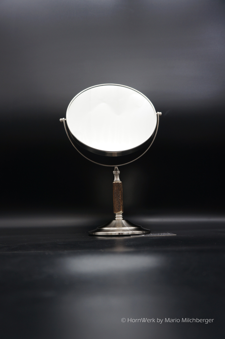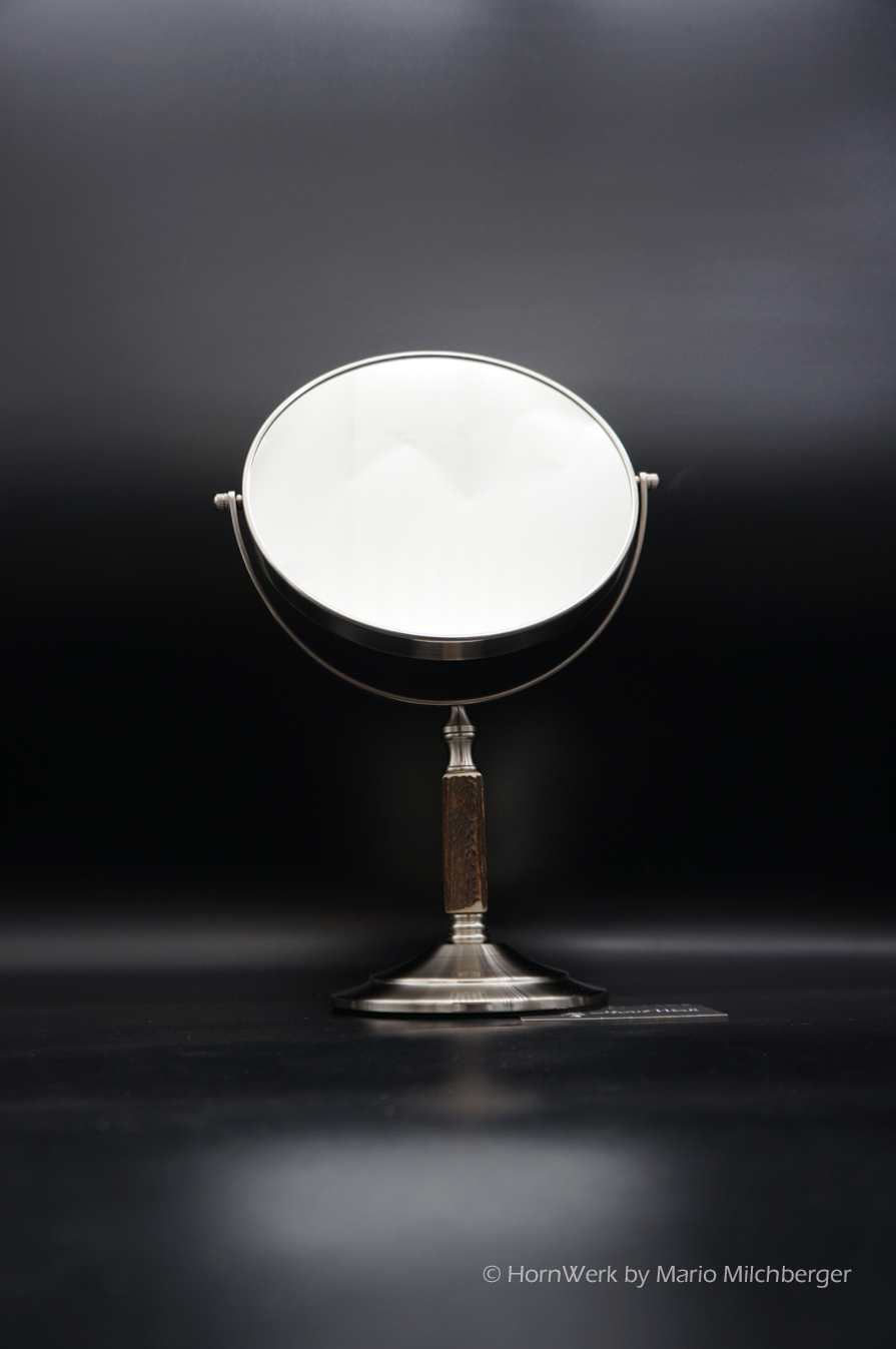 Ein ganz besonderes Stück und einfach perfekt für das jagdliche Badezimmer. Ein wunderschöner und sehr hochwertiger Spiegel kombiniert mit Hirschgeweih. Einfach wunderbar in Optik und Funktion. Der Spiegel hat auf beiden Seiten unterschiedliche Vergrößerungen. Auf der ersten Seite: 1 zu 1 – auf der zweiten Seite 1 zu 3. Weiter ist der Spiegel um 360° Drehbar und die Halterung besteht aus einer hochwertigen Edelstahloberfläche. Die Gesamthöhe beträgt 35cm und der Spiegeldurchmesser beträgt 20cm. Ein ganz wunderbares Unikat und ich wünsche bereits vorab viel Freude mit diesem Einzelstück. Lg Wmh Mario vom HornWerk