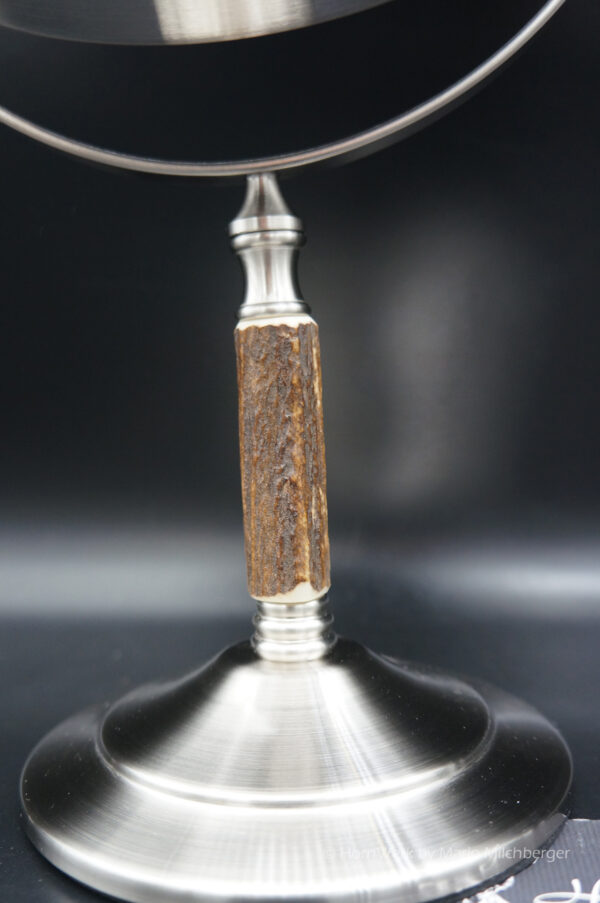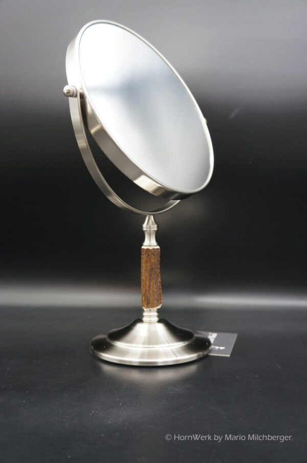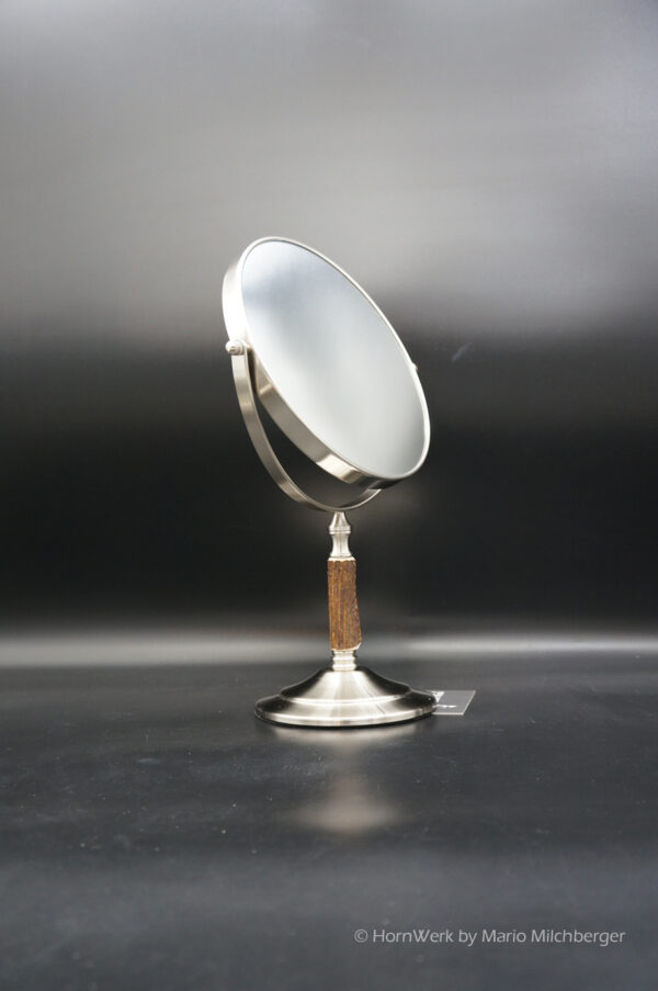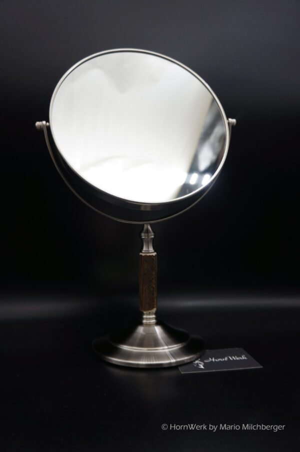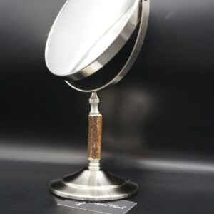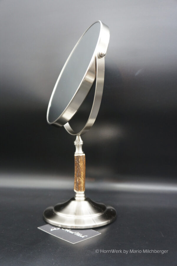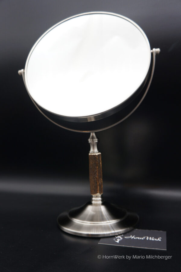 Ein ganz besonderes Stück und einfach perfekt für das jagdliche Badezimmer. Ein wunderschöner und sehr hochwertiger Spiegel kombiniert mit Hirschgeweih. Einfach wunderbar in Optik und Funktion. Der Spiegel hat auf beiden Seiten unterschiedliche Vergrößerungen. Auf der ersten Seite: 1 zu 1 – auf der zweiten Seite 1 zu 3. Weiter ist der Spiegel um 360° Drehbar und die Halterung besteht aus einer hochwertigen Edelstahloberfläche. Die Gesamthöhe beträgt 35cm und der Spiegeldurchmesser beträgt 20cm. Ein ganz wunderbares Unikat und ich wünsche bereits vorab viel Freude mit diesem Einzelstück. Lg Wmh Mario vom HornWerk