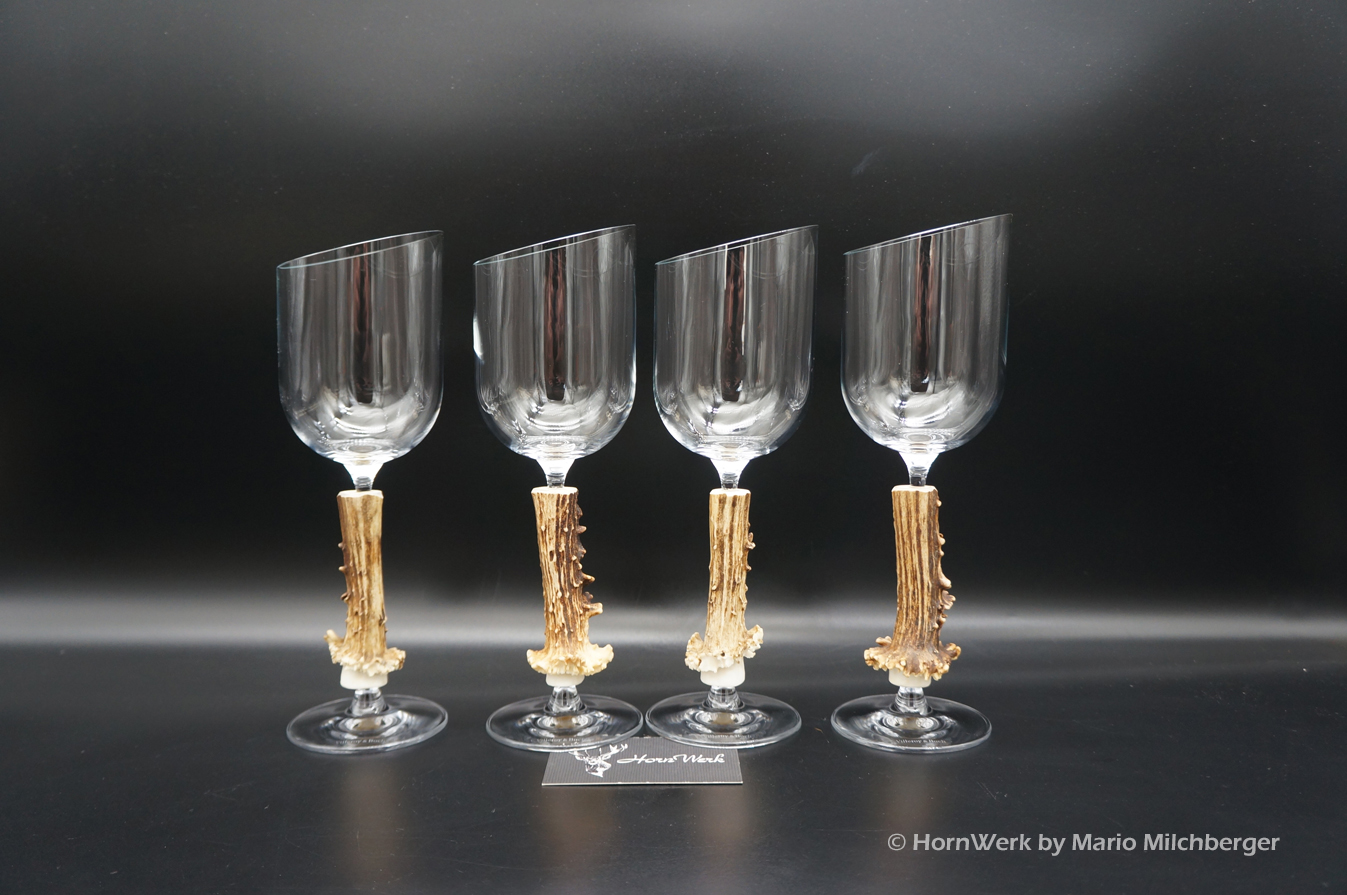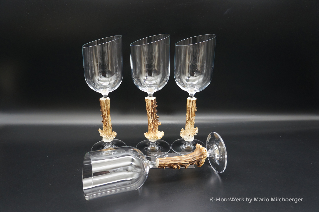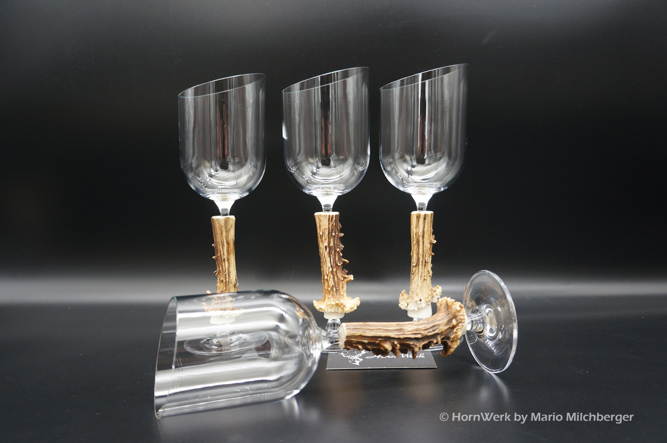 Ein großartiges und wunderschönes 4er Set Weißweingläser. Die Griffstücke bei diesen vier Einzelstücken wurden aus Reh gefertigt. Nicht nur optisch ein Highlight sondern durch dieses Griffstück liegen diese Gläser ausgezeichnet und absolut Rutschfest in der Hand. Als Rohling diente bei diesen Stücken ein hochwertiges Glas der Marke Villeroy & Boch. Die Gläser sind abgeschrägt und auch dadurch besonders auffällig. Ein großartiger Blickfang der alle Anwesenden begeistern wird. Ich wünsche bereits vorab viel Freude mit diesen schönen Unikaten und wünsche schon jetzt: Prost und zum Wohl. Lg Wmh Mario vom HornWerk