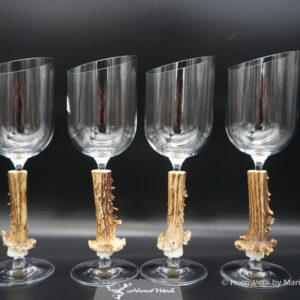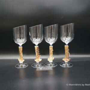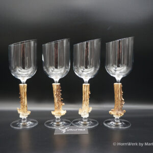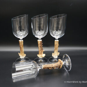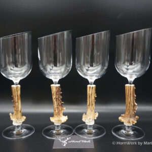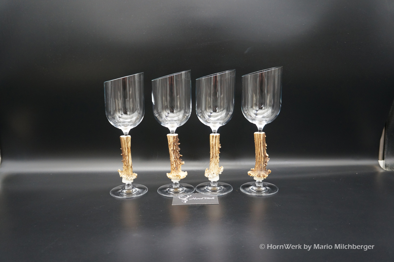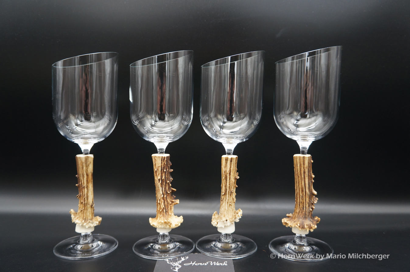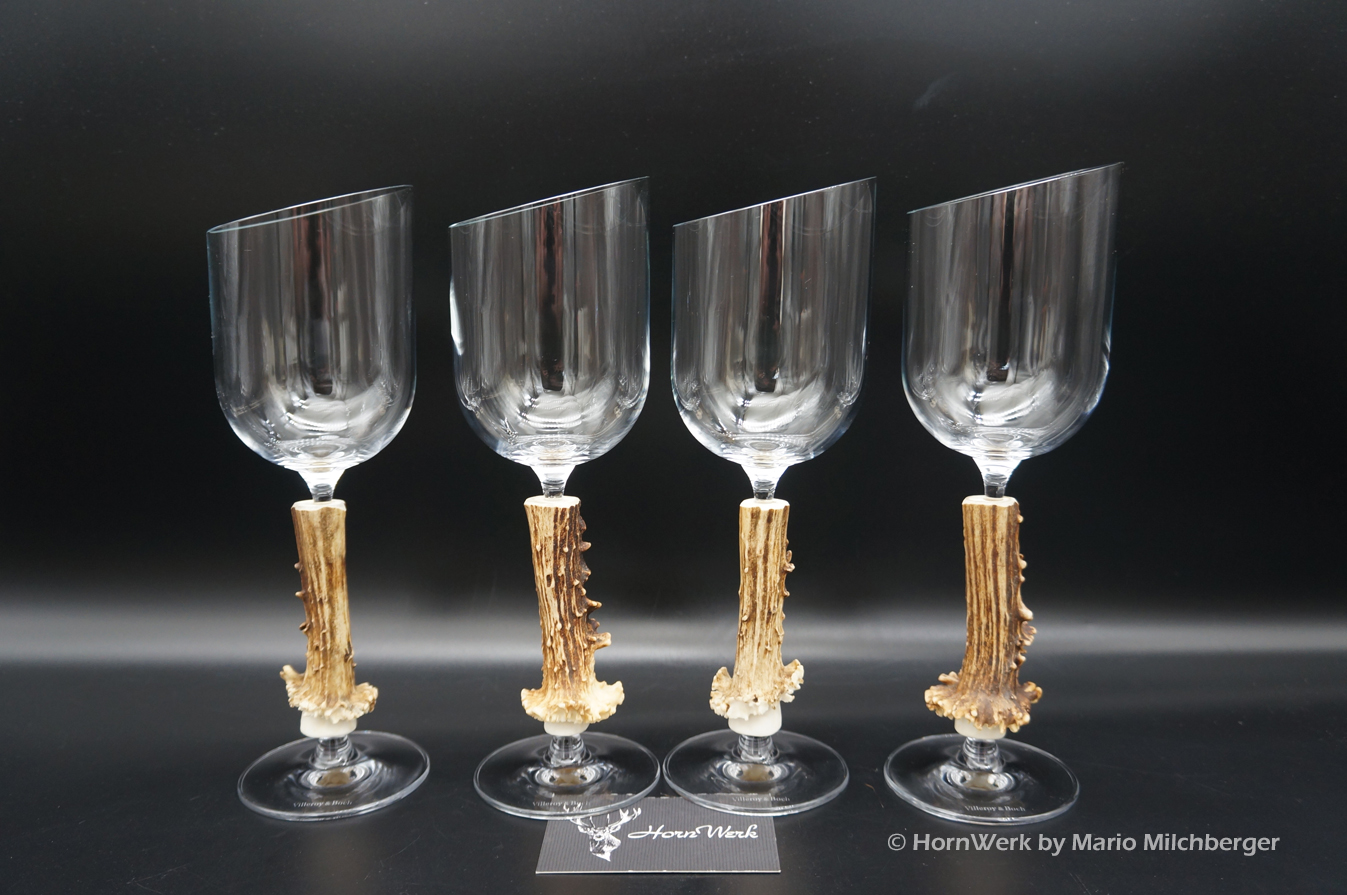 Ein großartiges und wunderschönes 4er Set Weißweingläser. Die Griffstücke bei diesen vier Einzelstücken wurden aus Reh gefertigt. Nicht nur optisch ein Highlight sondern durch dieses Griffstück liegen diese Gläser ausgezeichnet und absolut Rutschfest in der Hand. Als Rohling diente bei diesen Stücken ein hochwertiges Glas der Marke Villeroy & Boch. Die Gläser sind abgeschrägt und auch dadurch besonders auffällig. Ein großartiger Blickfang der alle Anwesenden begeistern wird. Ich wünsche bereits vorab viel Freude mit diesen schönen Unikaten und wünsche schon jetzt: Prost und zum Wohl. Lg Wmh Mario vom HornWerk
